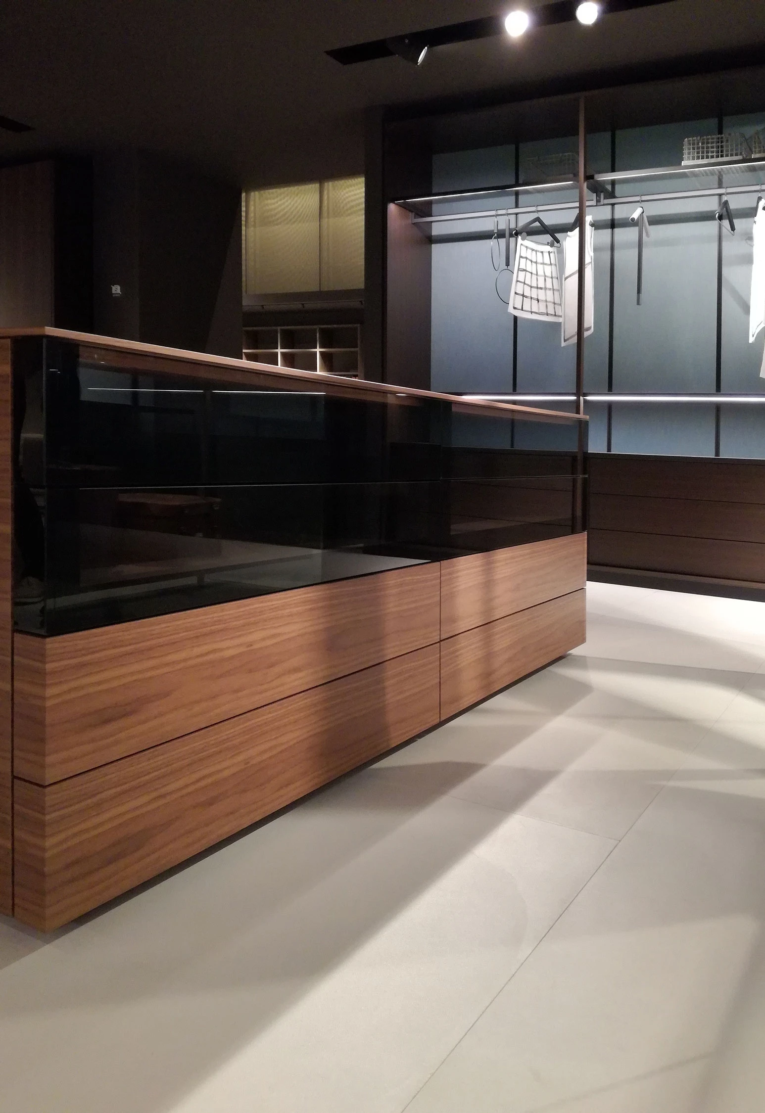 Hub features drawer units in two different widths, 905 and 1105 mm, with wooden or clear glass front panels. The drawer units can be placed side by side to create spacious single or double cabinets featuring different top finishes. The product range encompasses double-face central units, where drawers are combined with open shirt and bag holding modules, leather trays and comfortable leather benches to create ideal storage, displaying and holding solutions for the dressing room.