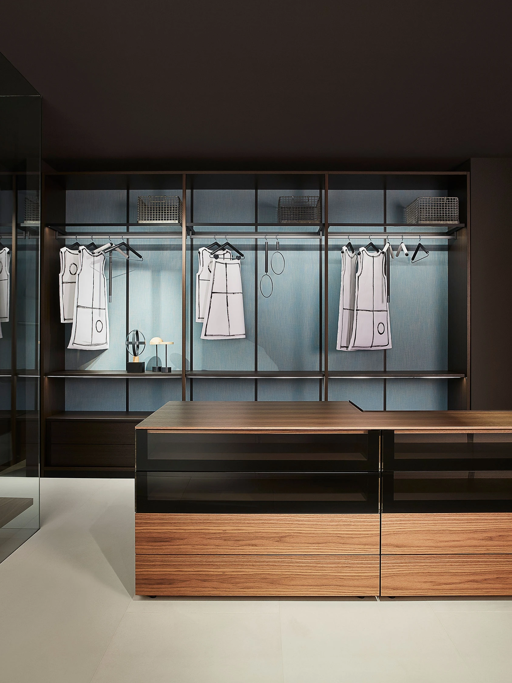 The Hub system of containers for the night area bears the Buratti signature for Porro: elegant structures where wood is integrated with other materials such as glass, marble and leather to respond to the functional and aesthetic needs of a bedroom, of a dressing room or a luxury boutique.