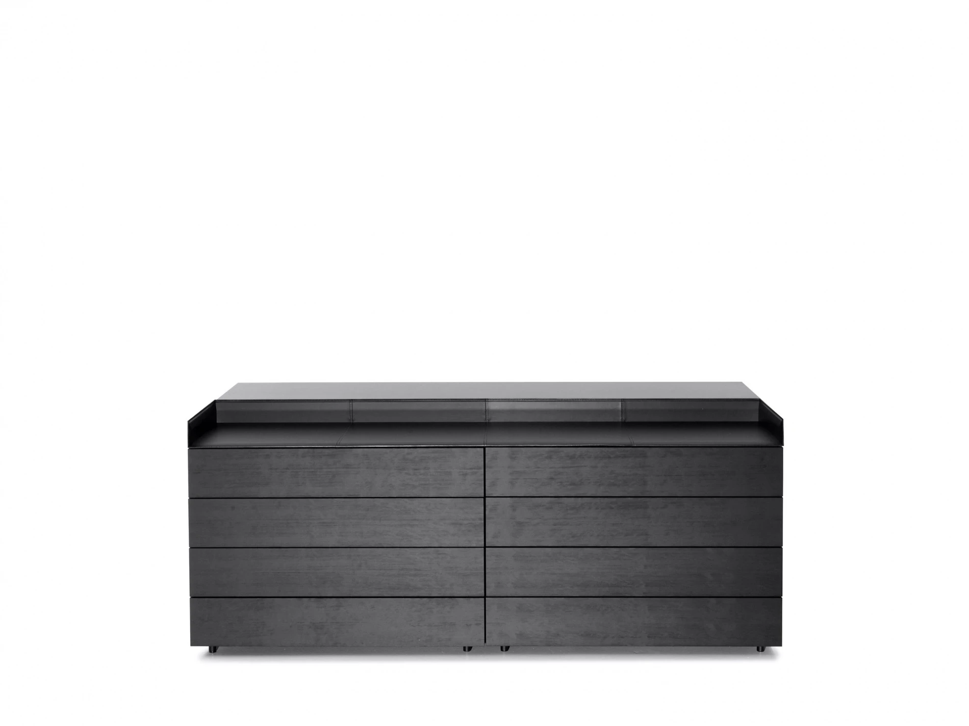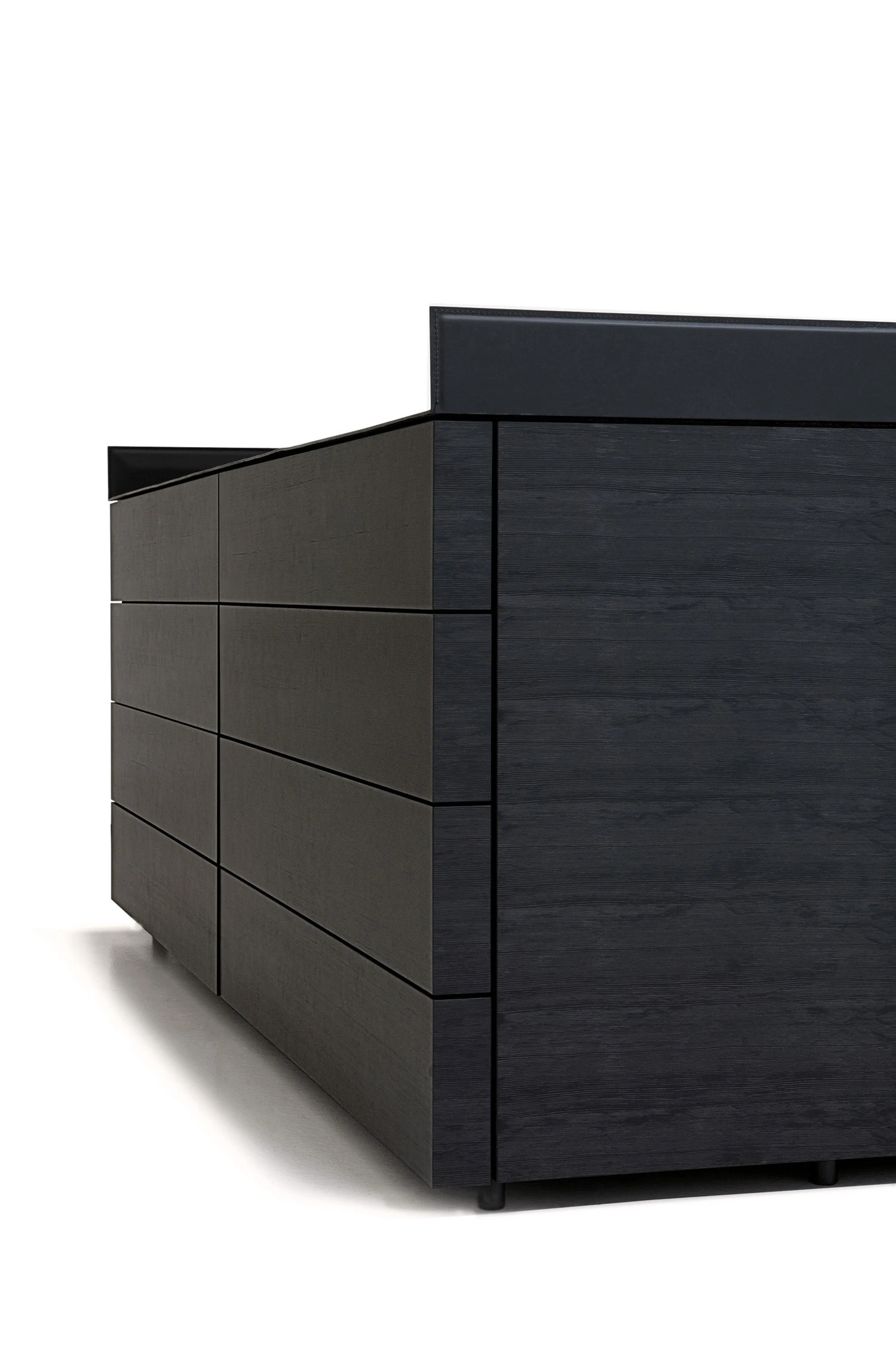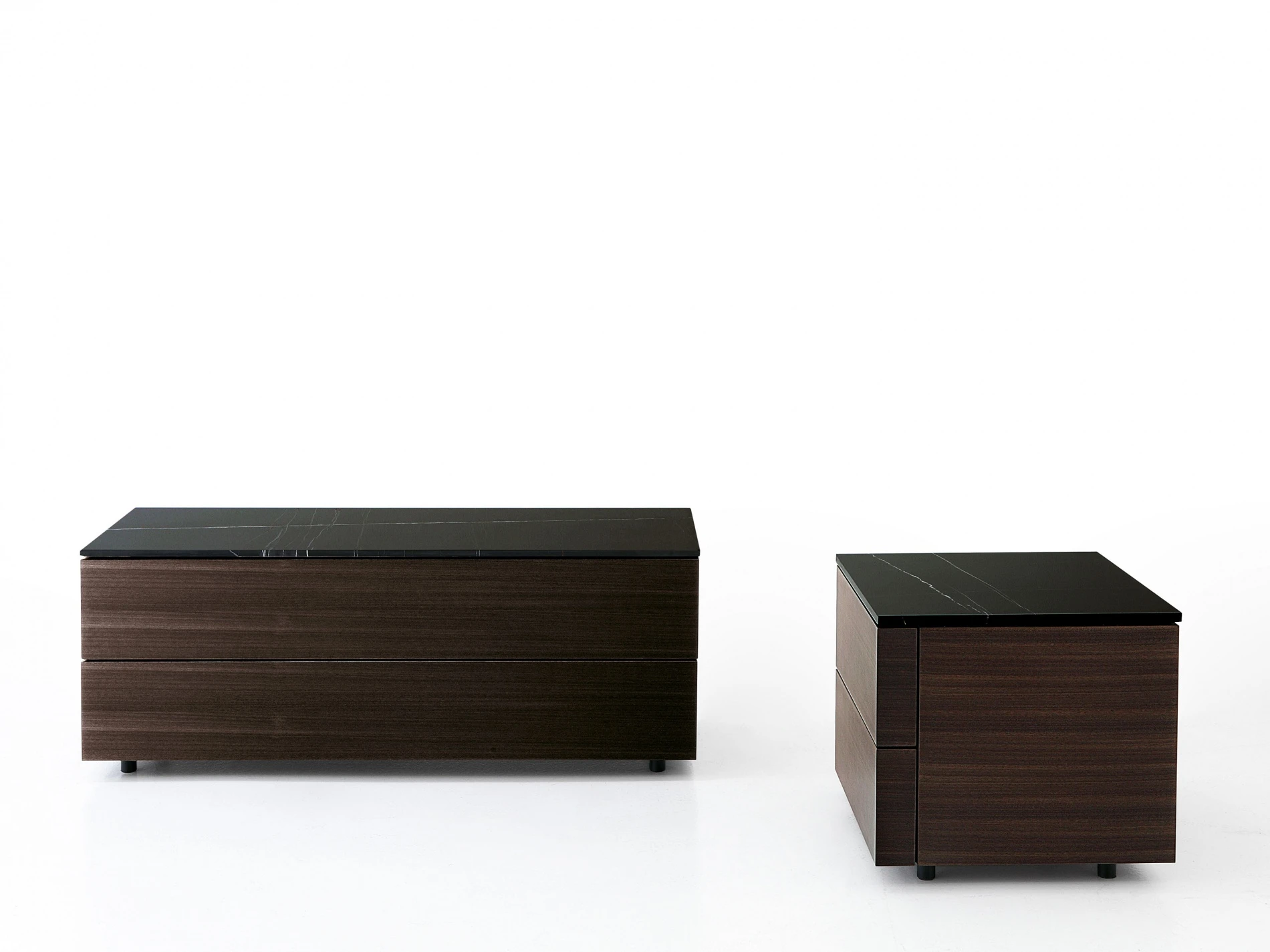 It features elegant wooden structures matching different materials on the tops, whereas the front panels are made either of wood with a folding technique or of silk-screened glass with fine leather or marble details.