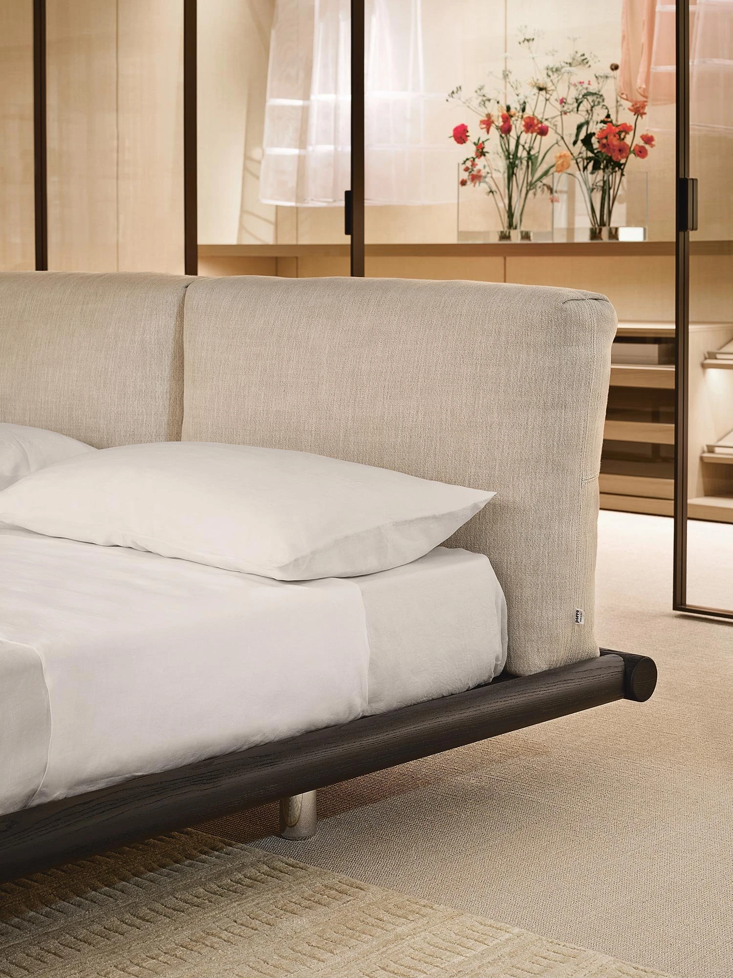 In the bedroom, the new Iro bed by GamFratesi evokes a Japanese scenery. Simple and sophisticated, it features two large headboard cushions and a frame in solid turned bruno tinted ash wood with a diameter of 80 mm, which stands out for the detail of the corner joint.