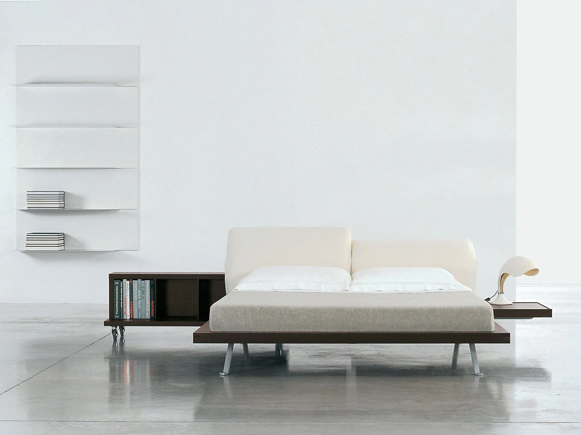 The Shinto bed revolutionized the concept of the sleeping area by introducing, for the first time, a central core around which other elements move freely: an adjustable and removable upholstered headboard, a wheeled storage unit, and bedside tables on coplanar surfaces. This design creates a space with endless possibilities while maintaining a precise geometric rigor.