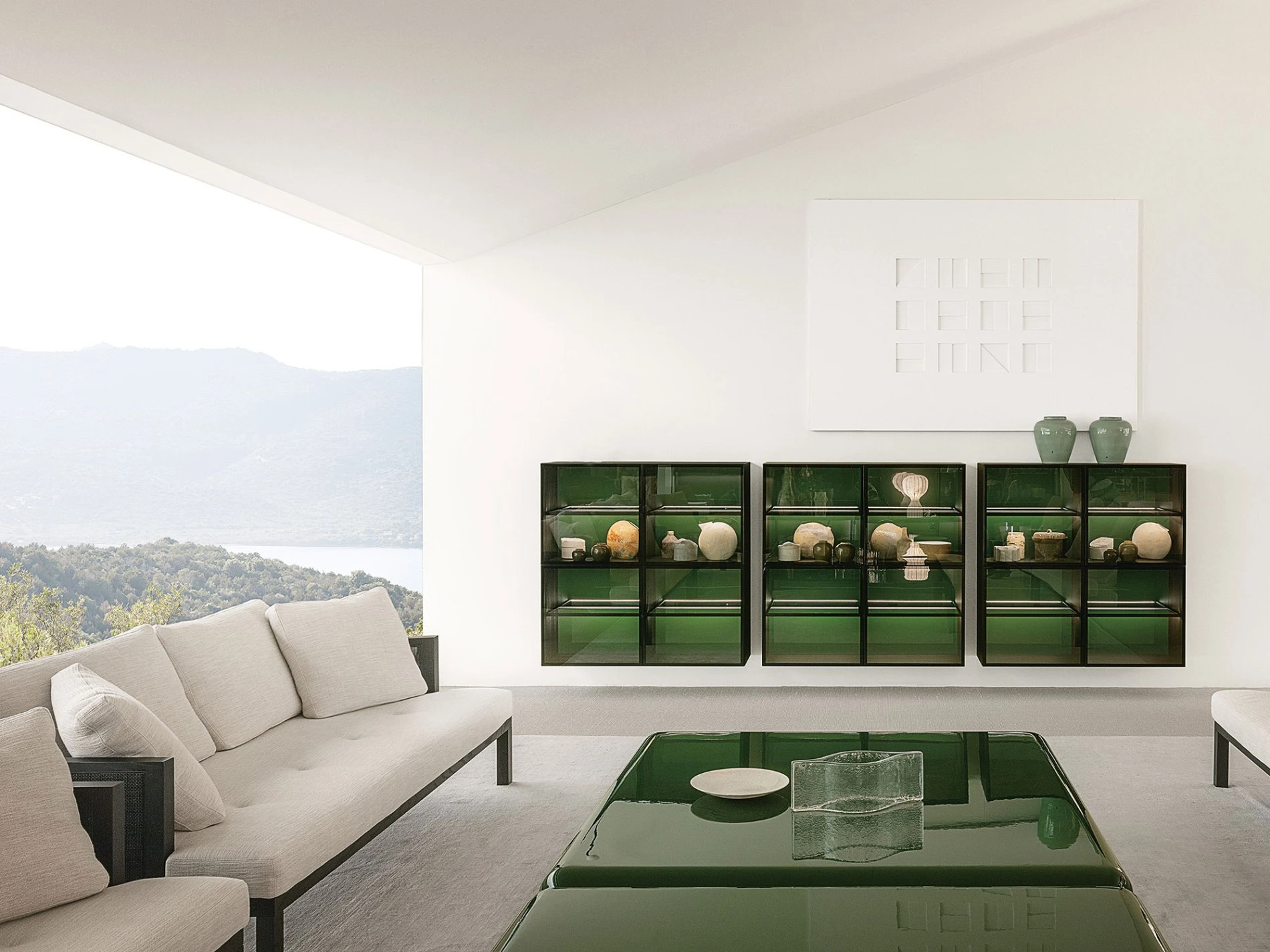 Born from research on freestanding cabinets, Ex-Libris is a precious display case both to the touch and the eye, designed to store and showcase rich collections. The supporting structure consists of aluminum uprights, a melamine base and top, and crystal sides available in varying degrees of transparency. The back panels can be made from melamine, fabric, or crystal, enhancing the ethereal aesthetic of this transparent box—ideal for central room compositions that divide spaces while maintaining visual communication. The shelves, in transparent extra-clear glass, contribute to the magic of this piece, where objects appear to float in the air, protected by sculptural Iron doors or minimalist flush Block doors. To illuminate the interiors, one or two spotlights can be added to the top of each module.