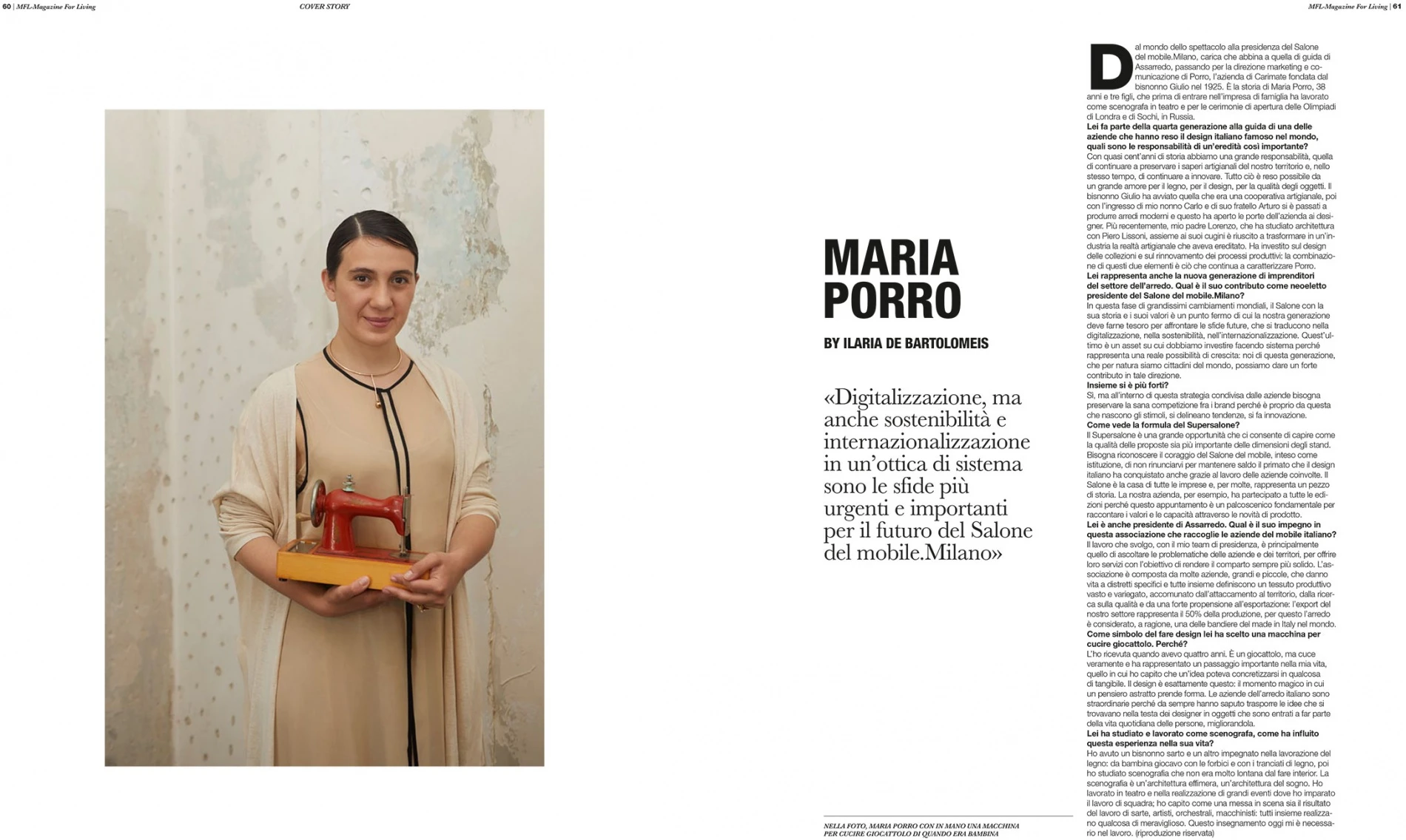 Maria Porro featured on the cover or MFL, September issue, in the “Design Queen” story. Talent scouts, managers, creatives: six women bring Milan back to the center of the world's interior design focusing on intuition, rigor and courage, with a feminine touch. The story of Maria Porro is narrated by Ilaria De Bartolomeis, from the world of entertainment to the presidency of the Salone Milan, combined with the guide of Assarredo, passing through the direction of marketing and communication of Porro, the company in Carimate founded by his great-grandfather Giulio in 1925.