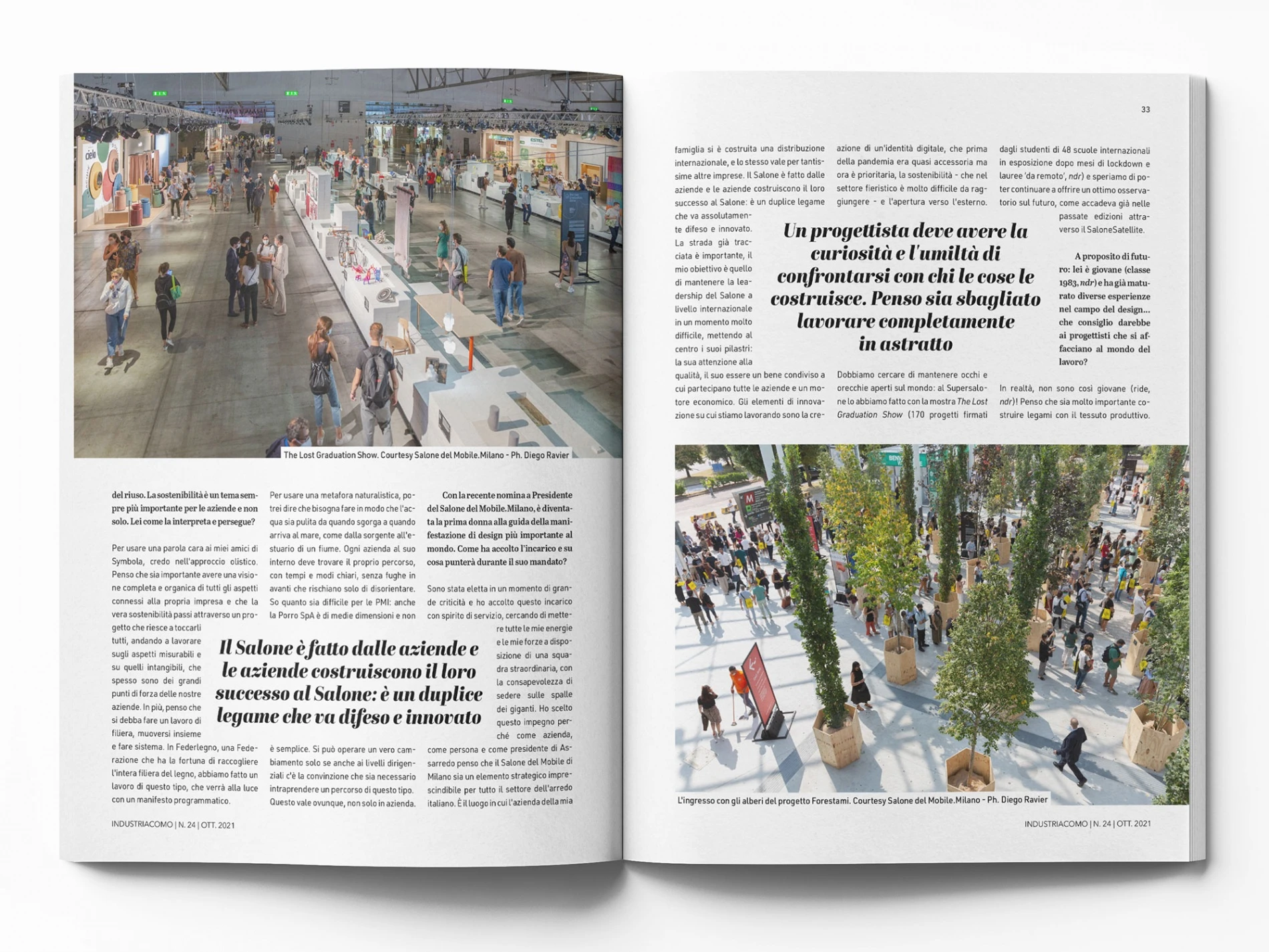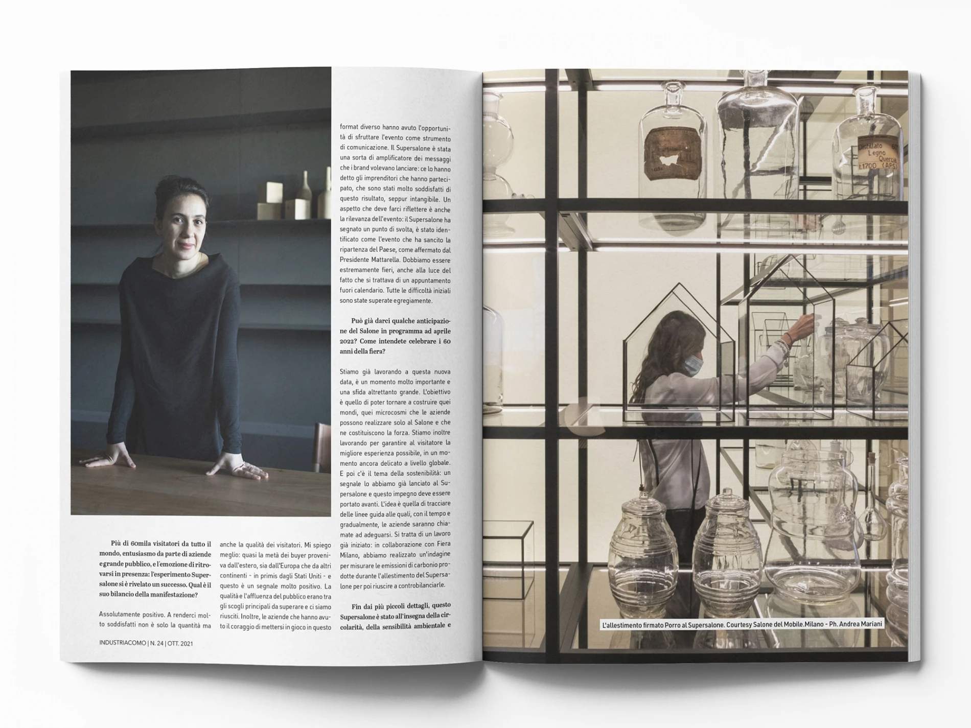 Maria Porro in her interview for IndustriaComo magazine speaks about the success of Supersalone, the event that sanctioned the restart of the country and the design world. The companies that had the courage to get involved in this different format, had the opportunity to exploit the event as a real communication tool, a sort of amplifier of the messages that the brands wanted to launch. Among them Porro S.p.A., mixing digital and physical storytelling, through the Electric Box installation by Piero Lissoni. The occasion to tell about the company’s ingredients, a shared culture, a focus on work and quality, both formal and aesthetic, and then curiosity and humility, even when dealing with new and unexpected markets and with designers and producers from all over the world. And to reveal its holistic approach to sustainability: a complete and organic vision of all aspects related to the company, working on measurable but also intangible aspects.