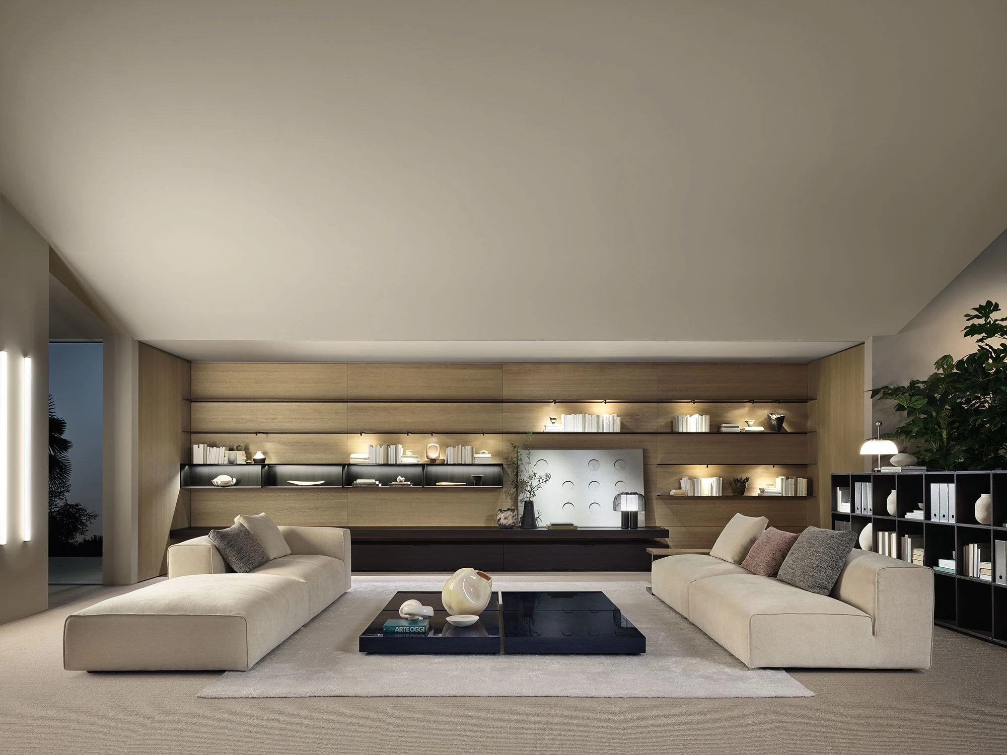 The modular Load-it bookshelf, designed by Wolfgang Tolk in 1995, celebrates its thirtieth anniversary this year: an important milestone for a project that continues to evolve over time, renewing its relevance through new combinations of materials and functions. Among these, the union of Load-it’s elegant minimalism with the versatile functionality of the Modern system by Piero Lissoni + CRS Porro stands out, giving rise to a variety of wall-mounted compositions in a refined play of shapes and finishes.