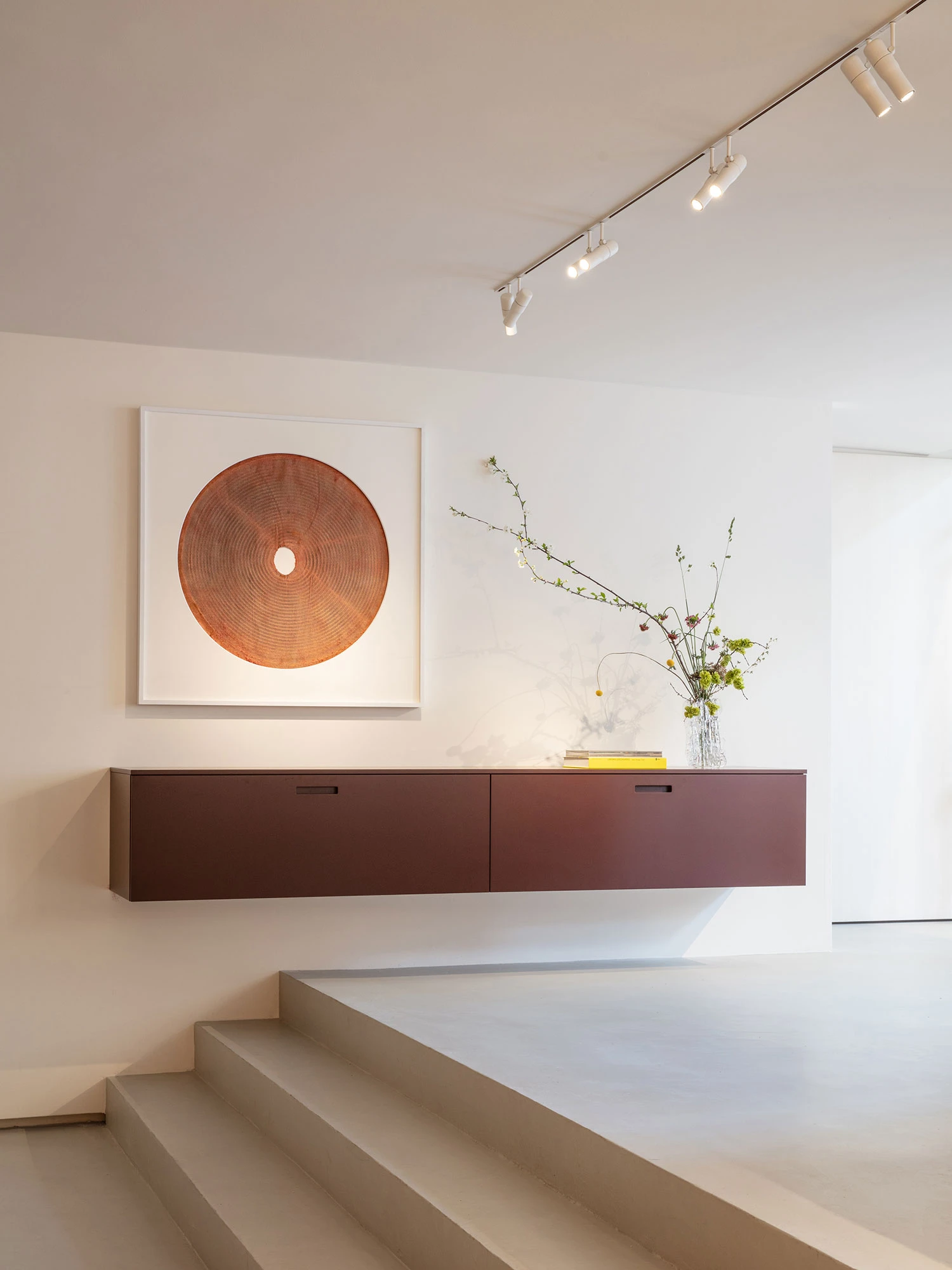 Vibrant contemporary atmosphere The suspended Modern composition in azuki lacquer, composed by two modules with flap door and Boite-Aux handle, recalls the system’s iconic rectangular arrangements from the 1990s. The result is a vibrant, contemporary atmosphere – where past and present engage in a continuous dialogue, shaping an ever-evolving design narrative.