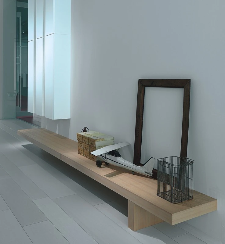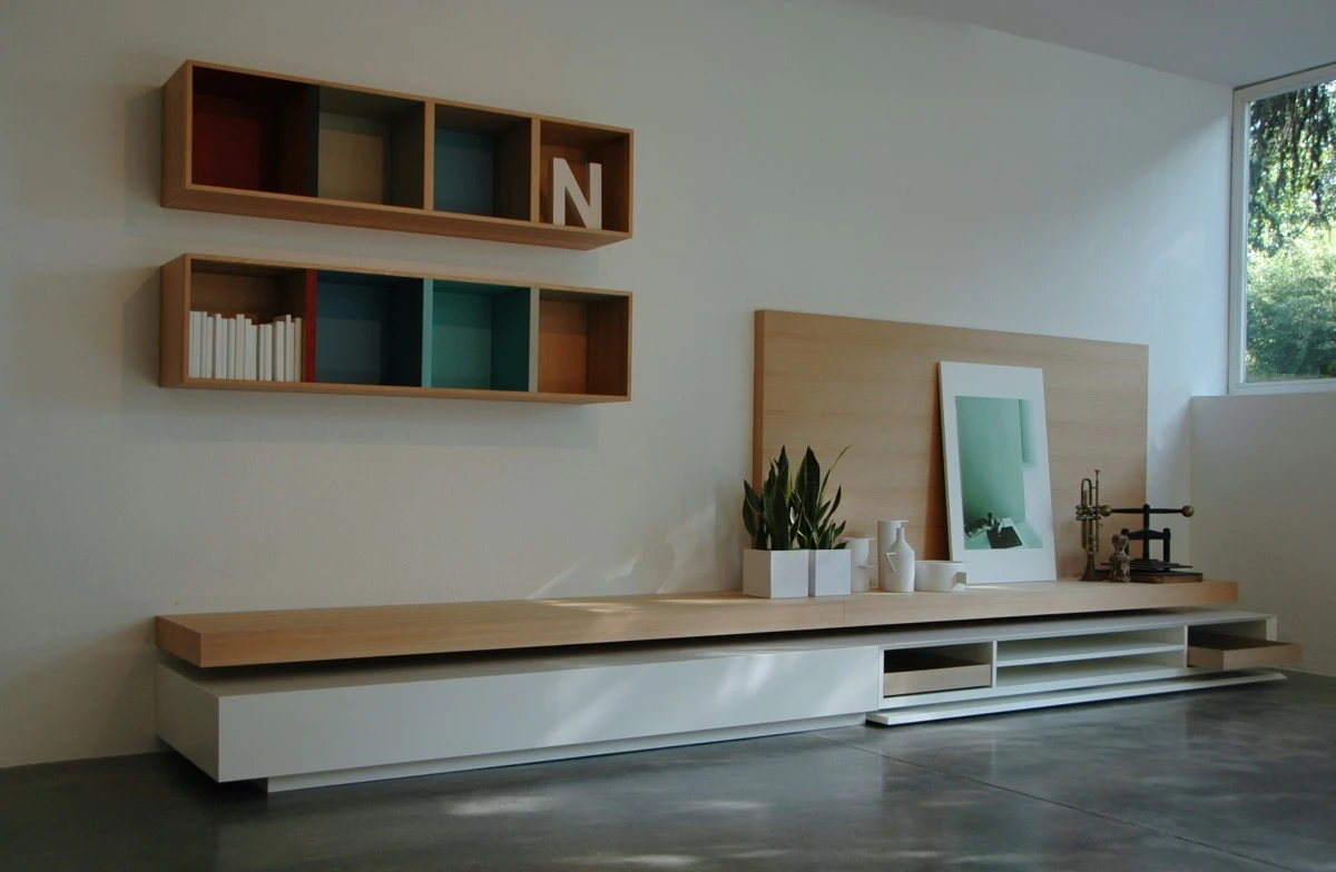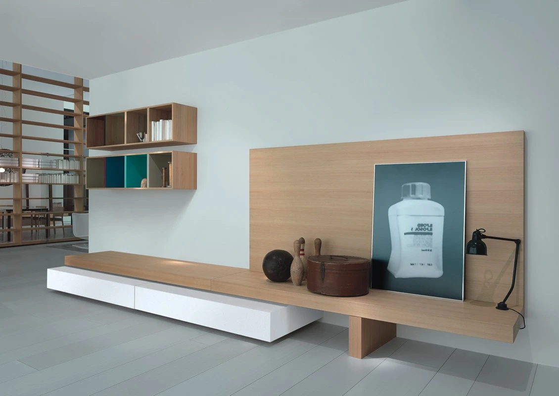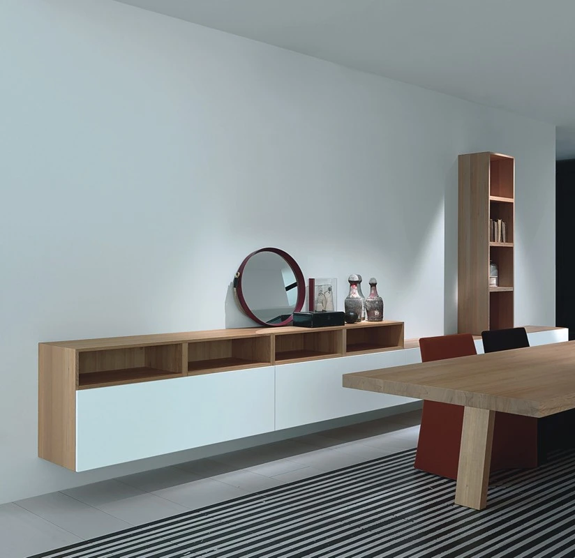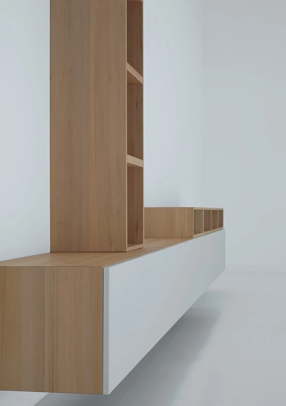 For the living area, 6 white vertical wall-mounted storage units are contrasted with a long wall-mounted shelf-bench made of thick natural hemlock. A tv composition combines 2 new white matt lacquered platforms - with drawers and folding doors, ideal for DVD players, VCRs or decoders - with a TV panel in hemlock to hang liquid crystal screens. To meet the requirements of storage in a dining room, it is proposed in a succession of closed storage units with white lacquered doors on which is superimposed, vertically, hemlock open boxes.