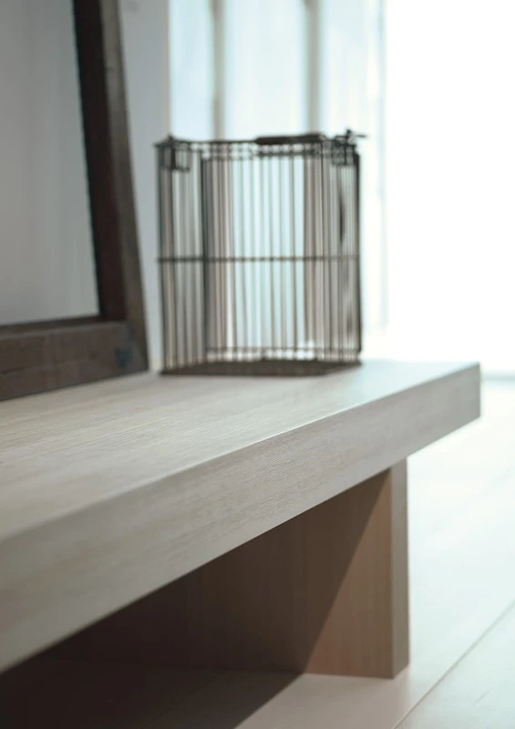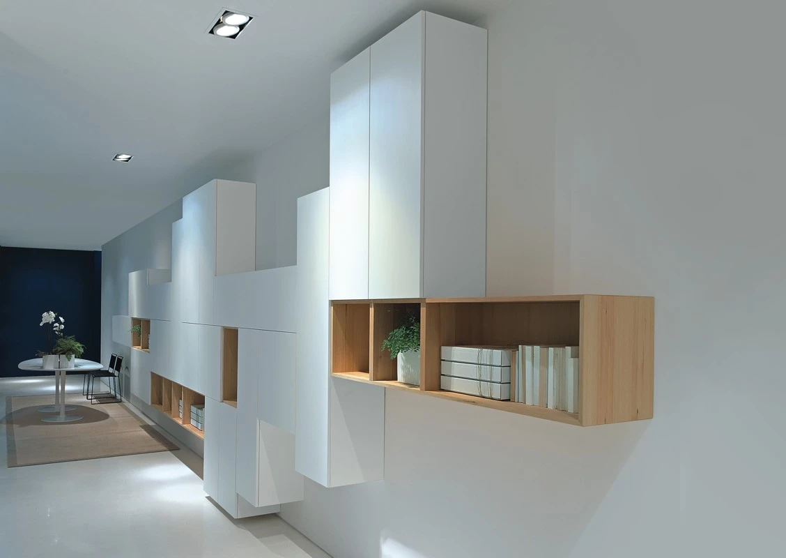 3 new compositions of Modern, the system in continuous evolution to have fun dividing up spaces rationally thanks to the repetition of regular volumes generated by a square on the walls, floor or at the room’s centre, are enchanting with their delicate tone-on-tone approach of white paint and pale wood.