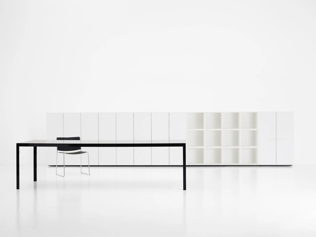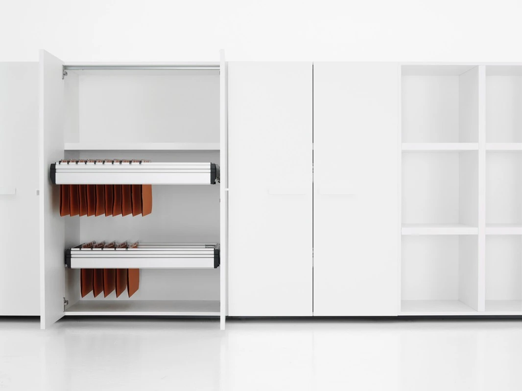 Best properties of resistance to wear, to scratches and chemical agents, characterise the new compositions of Modern work: the use of HDS, a new generation material that is the product of the company research, make it even more suited to intensive and prolonged use over time. It is presented in a large hanging composition which contrasts boxes with structures and fronts made of white matt HDS with open modules made of solid hemlock wood, or in a white horizontal storage unit with the new suspension file holders.
