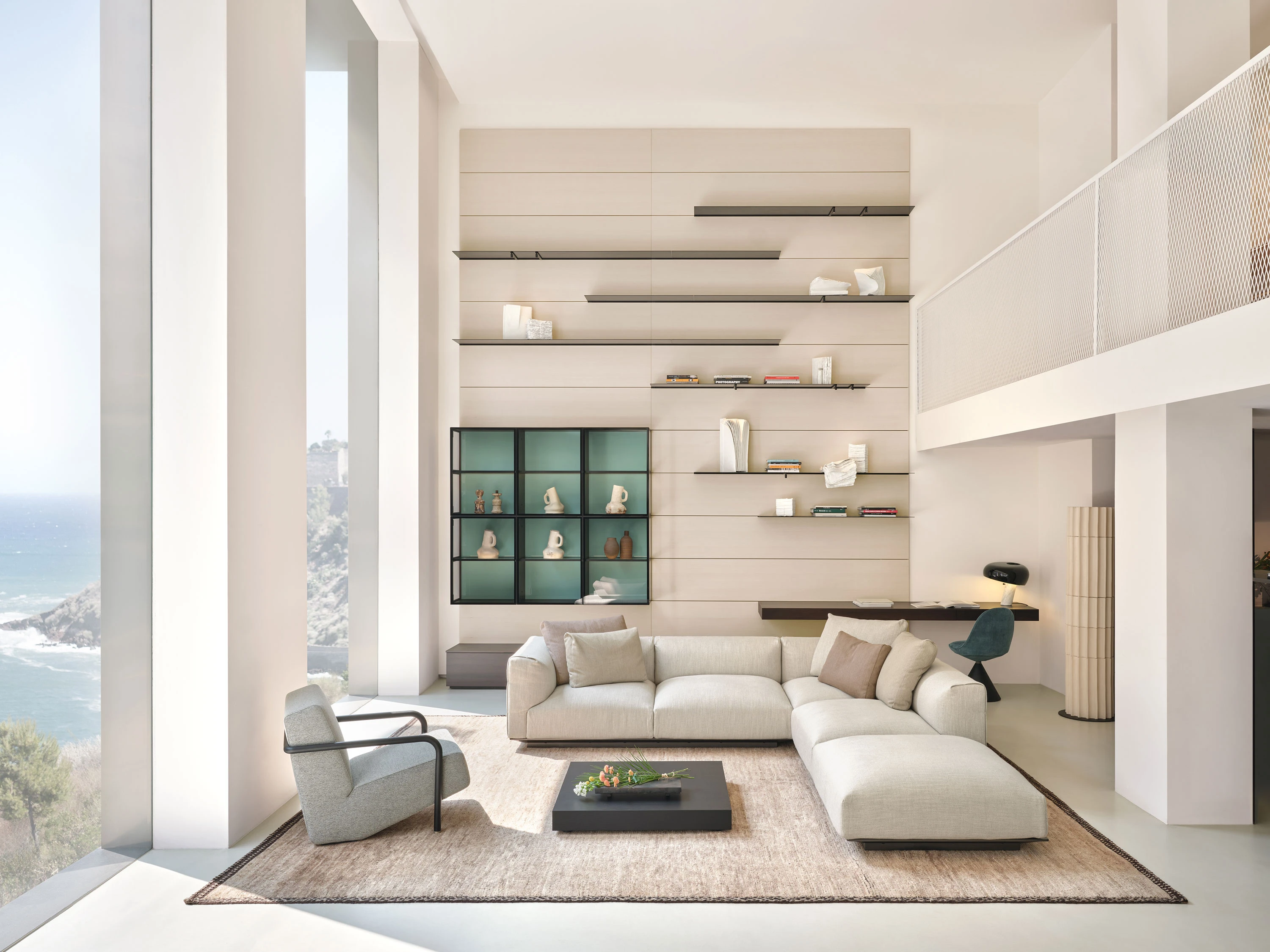 A contemporary aesthetic is fused with sartorial excellence in the Moulage sofa. Its refined look, with draping reminiscent of haute couture, highlights the project’s meticulous attention to detail and artisanal quality. Elevated off the ground, the sofa appears to float in space, conveying visual lightness and elegance. The composition is punctuated by large square cushions designed to offer a comfortable, relaxed seating experience, paired with soft, generous armrests and backrests, completed by loose cushions in soft down. The fabric, shaped with tailored pleats, defines volumes and surfaces with an almost sculptural touch, turning each element into an expression of style and craftsmanship.