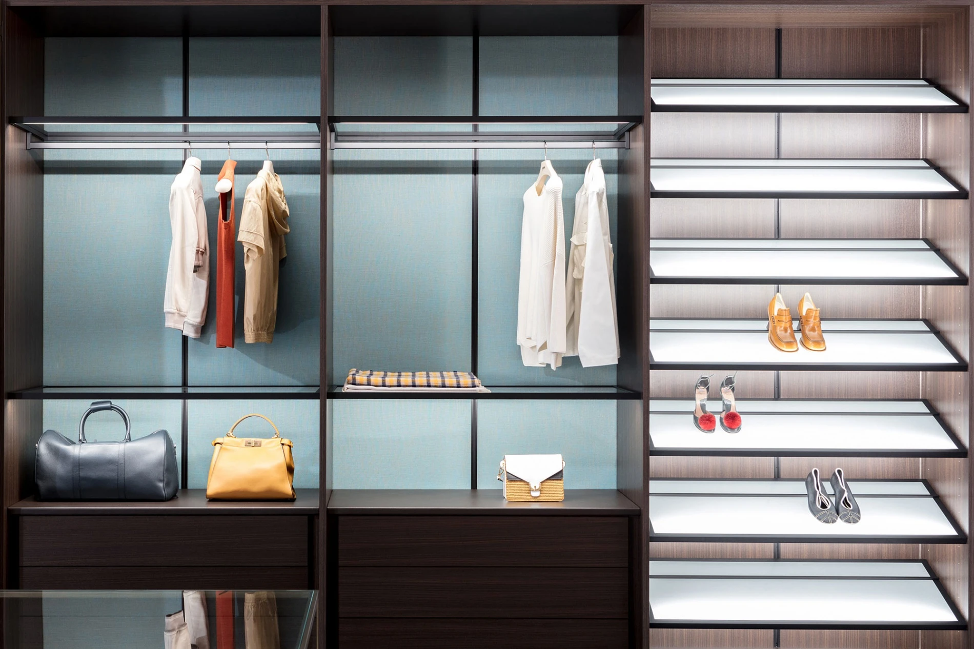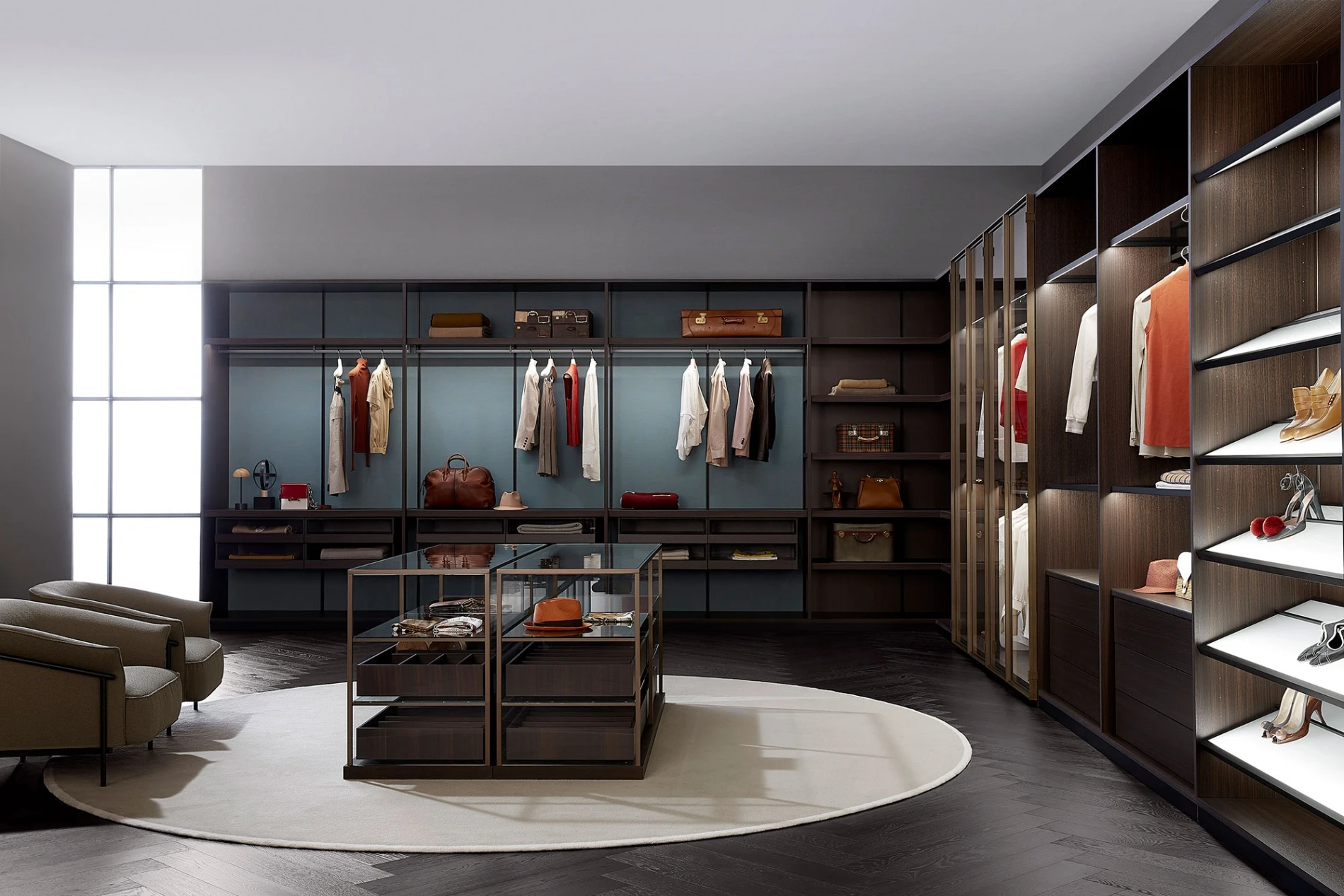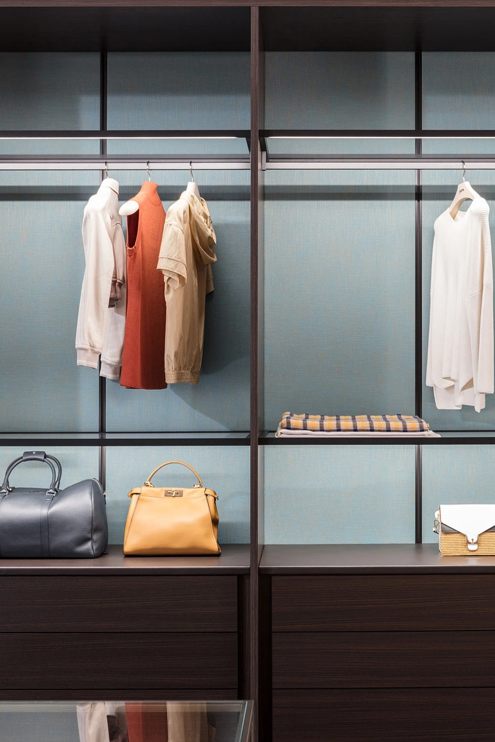 The L-shaped layout of Storage, the system able to contain and show off the objects stored, combines open modules with blue fabric backs with modules closed by burnished brass Iron doors and a shoe rack with bright inclined shelves. It is balanced by an aerial composition of Boutique Mast, the new generation system characterized by metal uprights on which to apply large cantilevered shelves and mirrors in the name of maximum freedom of expression.