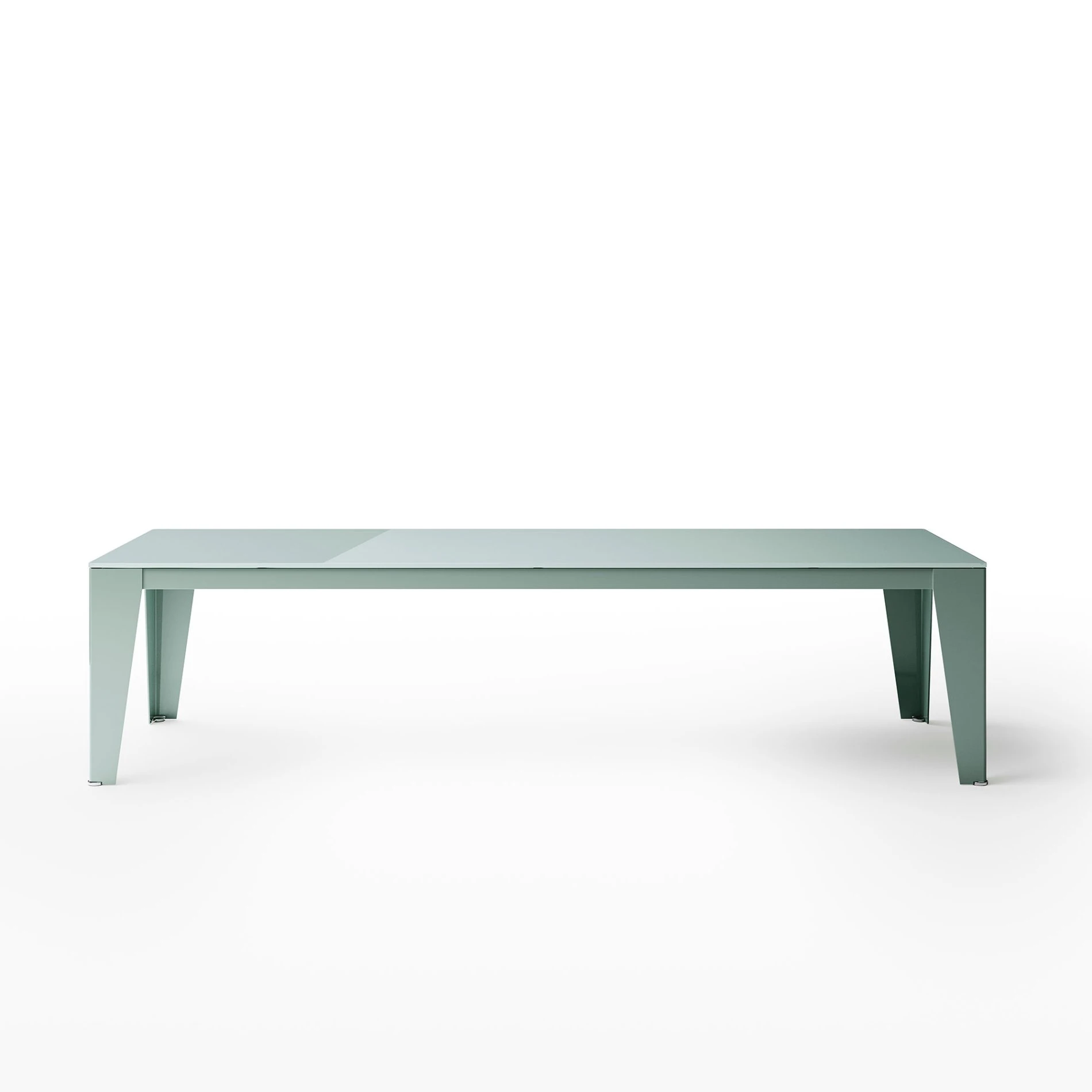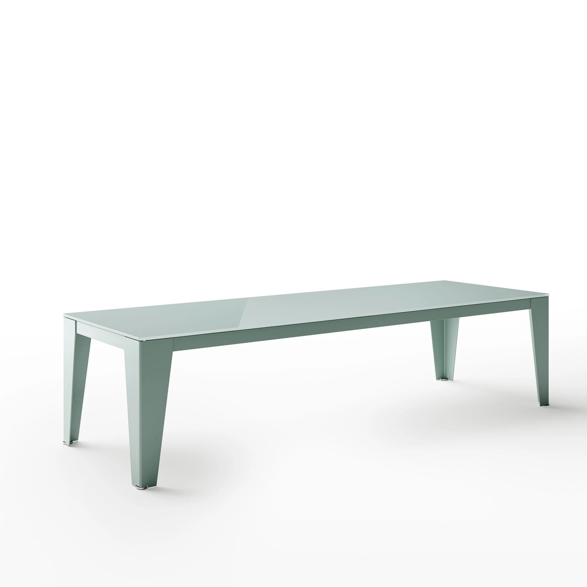 The sculpted legs provide strength and personality, while the tabletop offers a continuous surface thanks to the perimeter and cross reinforcements: maximum practicality in perfect proportions, available in different sizes. A minimal project that surprises with its unexpected nuances: in the dining version, the metal structure in glossy verde cardo finish is paired with a back-painted verde gris glass top, creating a refined optical interplay that evokes the delicate chiaroscuro of nature. In the low living version, the metal structure meets a marble top, opening up to new creative languages.