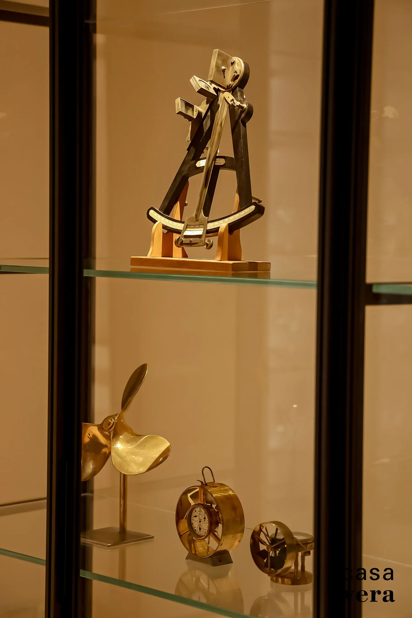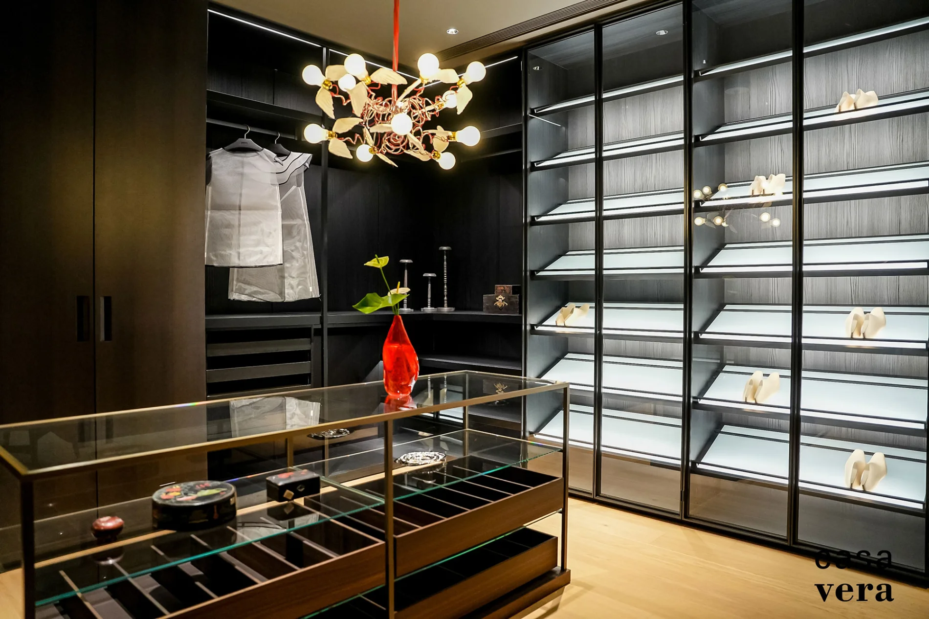 In the night area, the Storage system, design Piero Lissoni + CRS Porro, creates an angular solution alternating wooden doors with recessed Oslo handles, open compartments in black sugi melamine, and a shoe cabinet with enlightened shelves. At the center, the Acquario freestanding chest of drawers in transparent crystal with burnished brass profiles becomes a refined showcase for personal objects, perfect for both residential spaces and high-end boutiques.