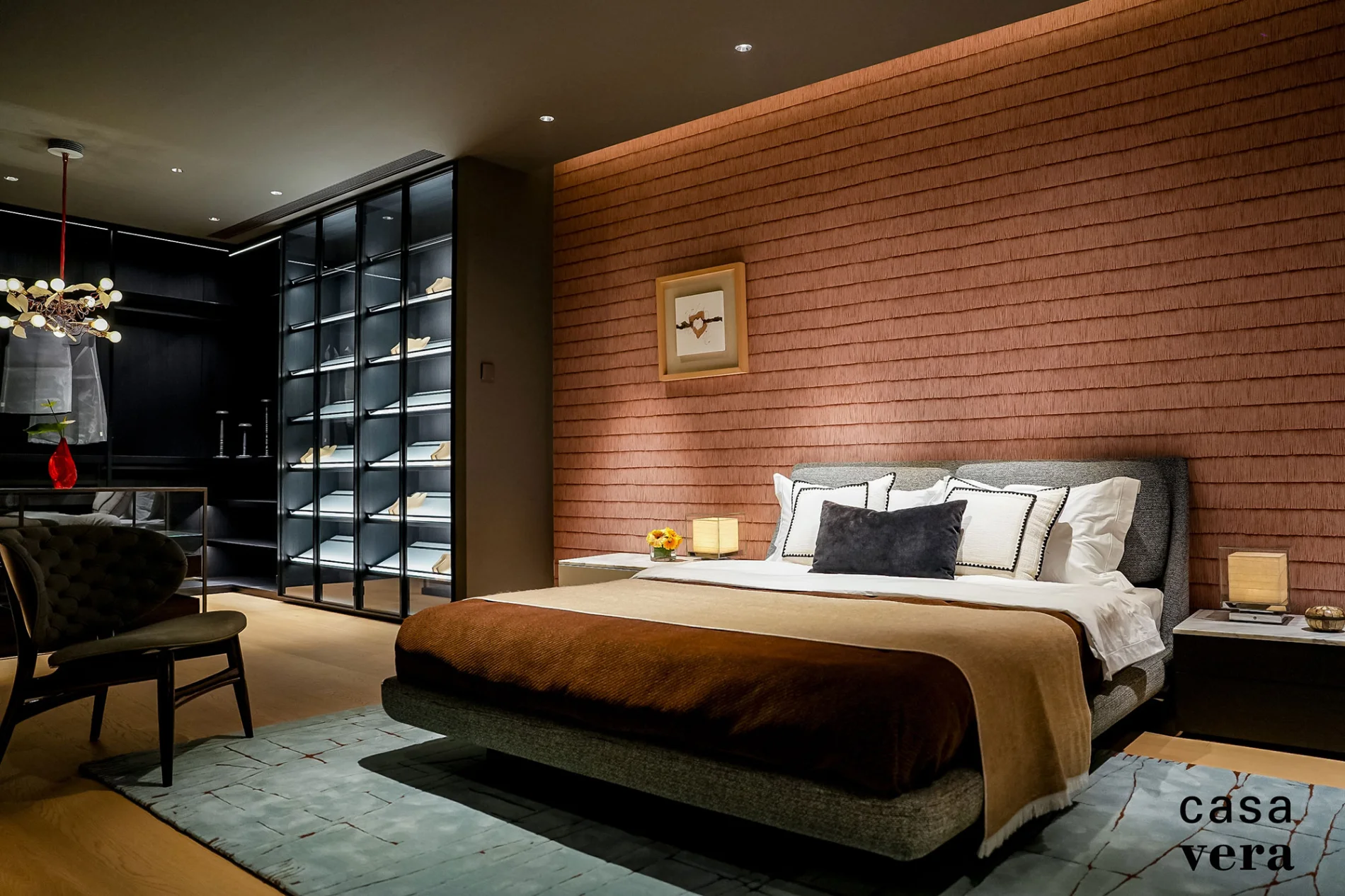 Finally, the last wardrobe environment features a Storage Battente composition with saddle leather doors, paired with a transparent solution with Iron glass doors and cuvée-finished frames. At the center stands the Hub central drawer unit by Oscar and Gabriele Buratti, complete with a fabric bench that provides a dedicated seat for admiring one’s wardrobe—true heart of the home and synthesis of Porro’s identity.