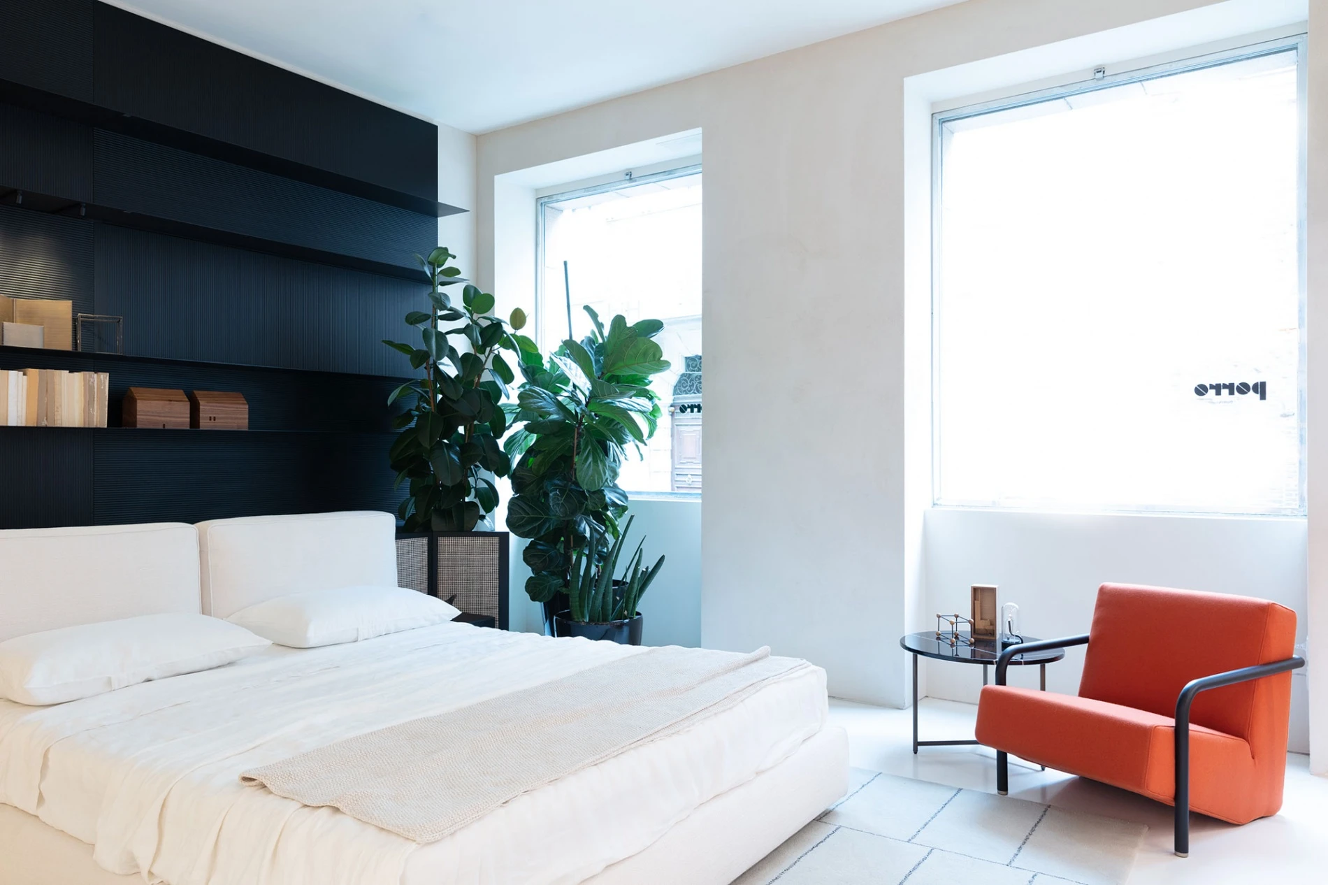 The bedroom features Piero Lissoni's intimate and compact Byron textile bed. Its lines are soft and the edges rounded, complemented by the sophisticated detail of the screen featuring a black-stained solid ash frame that surrounds a straw weave with a graphic black and white houndstooth pattern, balancing contemporary and memory, concrete and abstract.