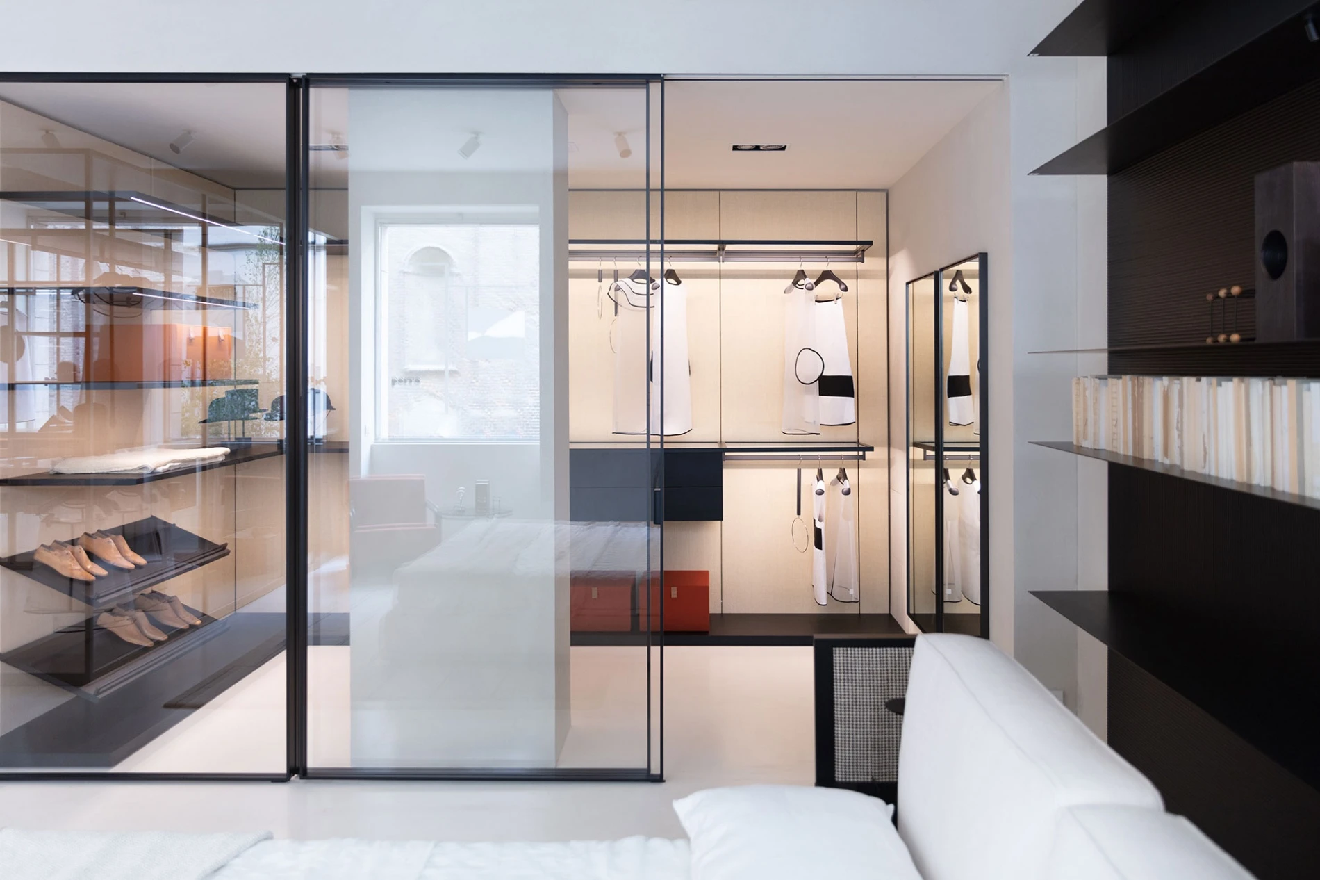 Technology and craftsmanship come together in a sophisticated interior full of light and colourful flashes thanks to the Glide Miru sliding partitions by Piero Lissoni + Iaco Design Studio, presented in glass decorated with precious metallic textures in the colour cuvée to match the frame. They lead to the real heart of the home, the Storage dressing room designed Piero Lissoni + Porro Research Centre, which combines transparent compartments, fully open or closed by glass doors, with the transparent corner solution.