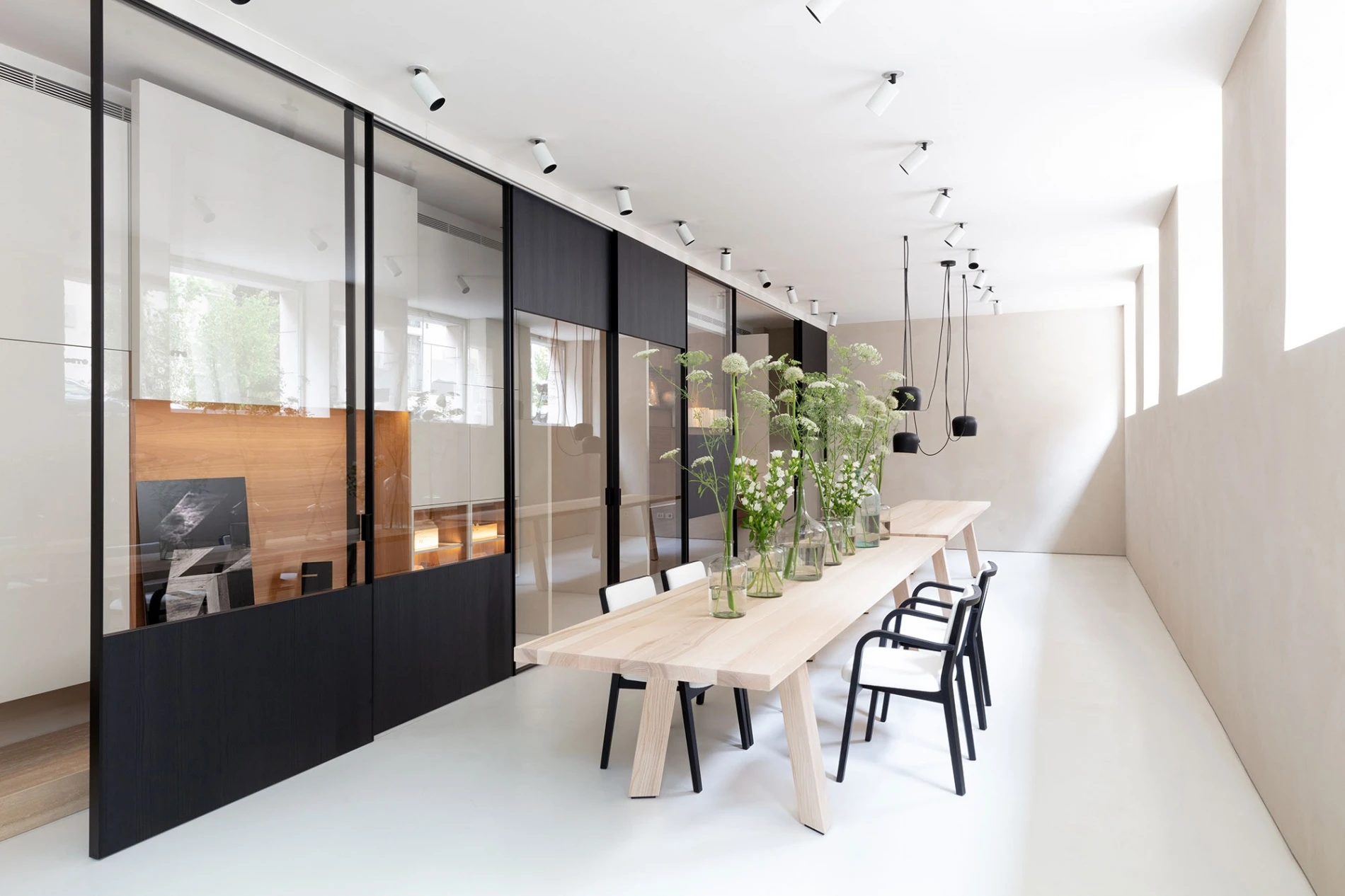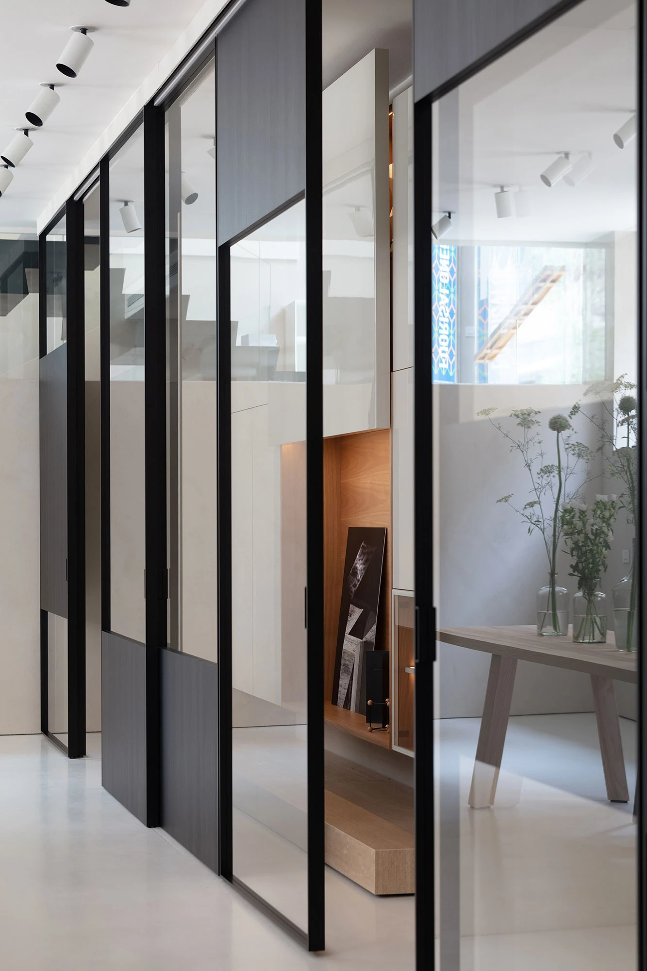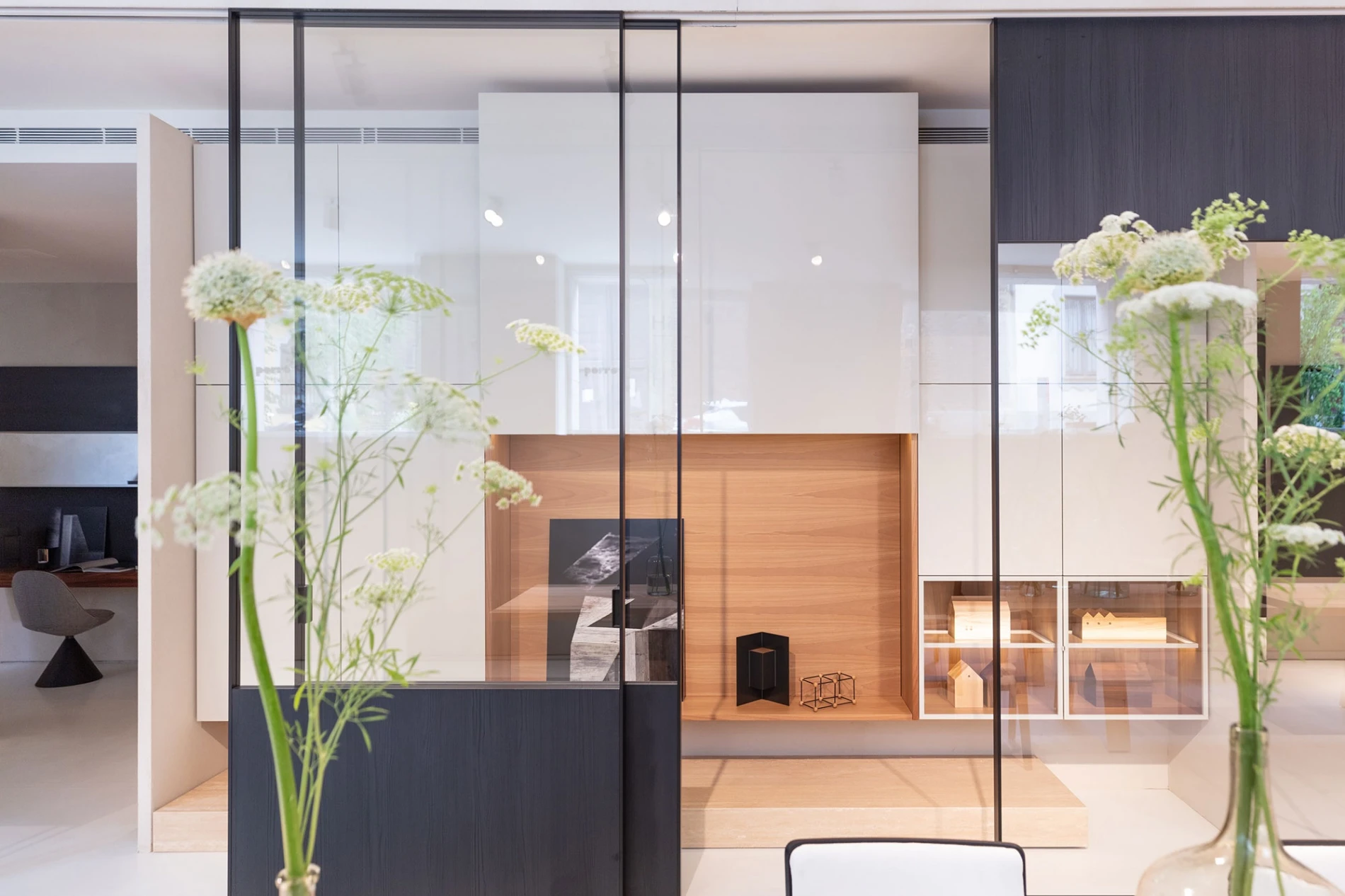 In the background are the Glide Samurai sliding partitions with a tailored cut, that complement the Glide system with a new interpretation of space. Freely inspired by the Japanese home and as the result of a skilful and accurate craftsmanship project, they allow to combine different textures and shapes – both transparent and matt – creating spectacular windows and unexpected views inside the Duriniquindici showroom.