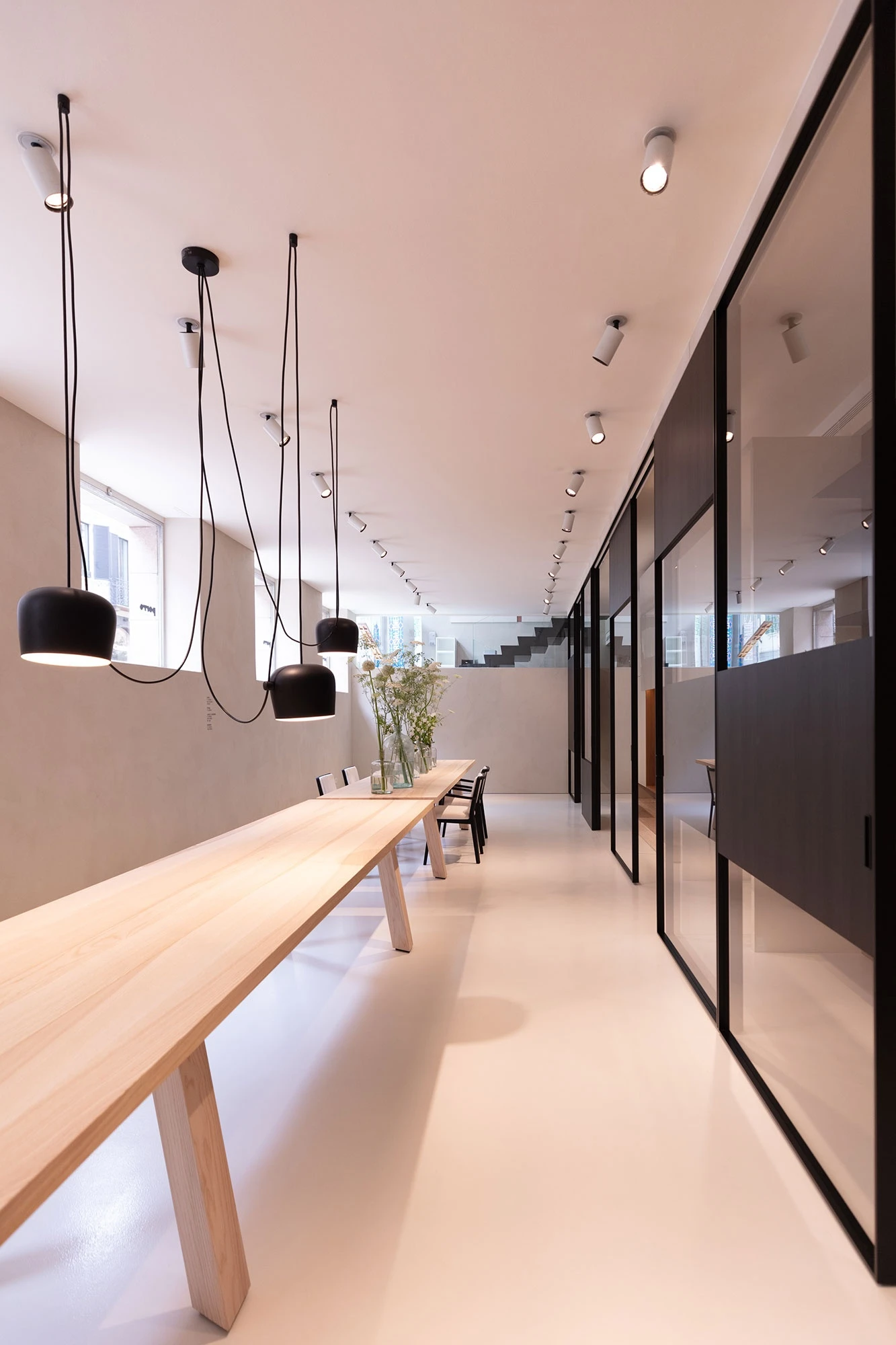 Geometrical purity, the beauty of materials and the métissage of ideas are again the protagonists in the large central showroom area, that can be seen through the windows. It is entirely dedicated to 2 Ryoba tables designed by Piero Lissoni to imagine a dining room, an office or a restaurant. The thick triangular legs create a trestle on which the textured tabletop lies, both re-proposed for the first time in solid olive ash.