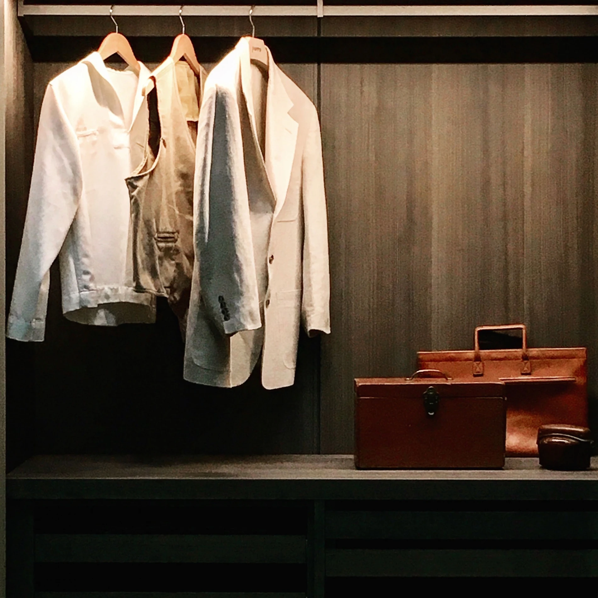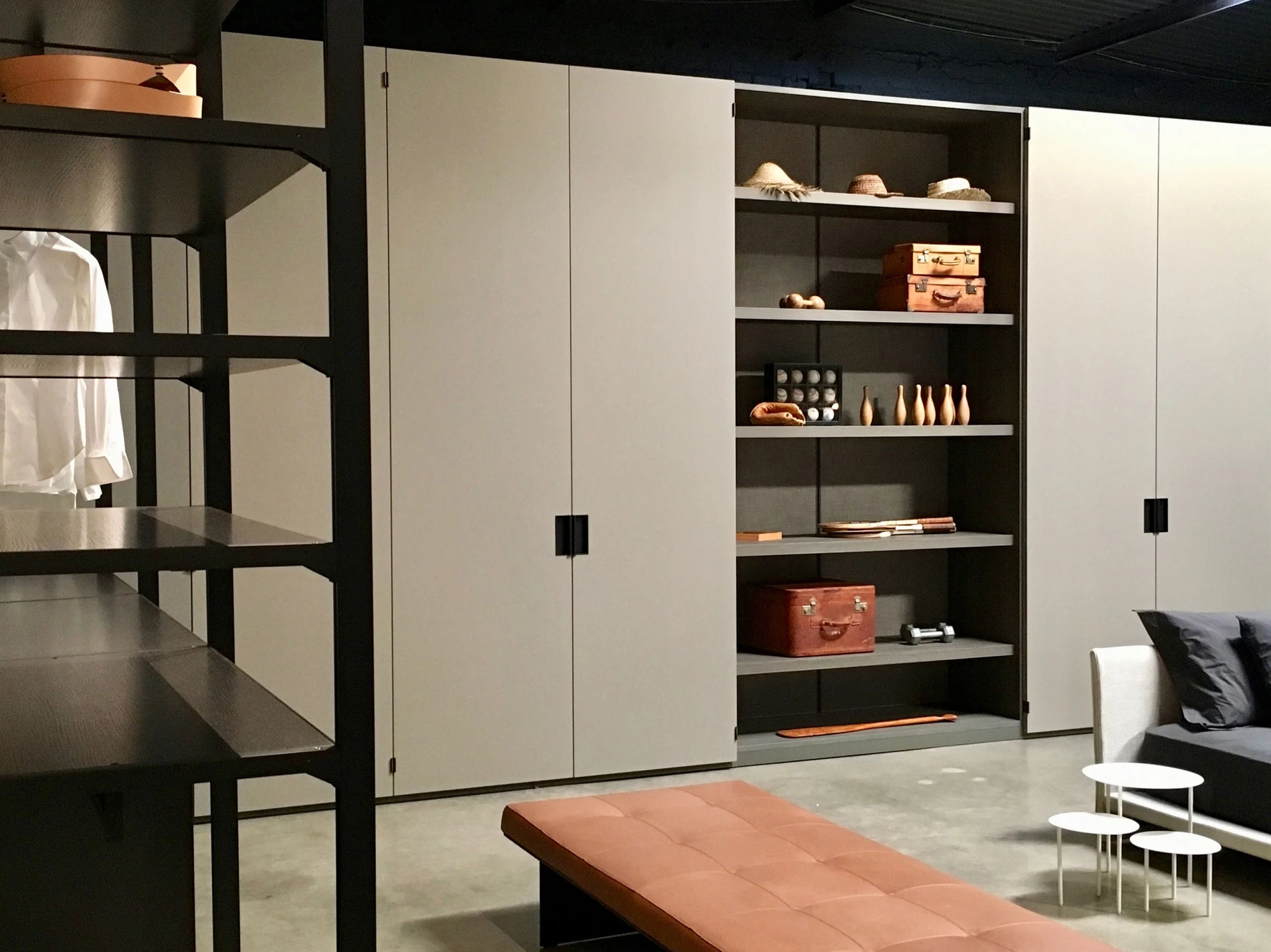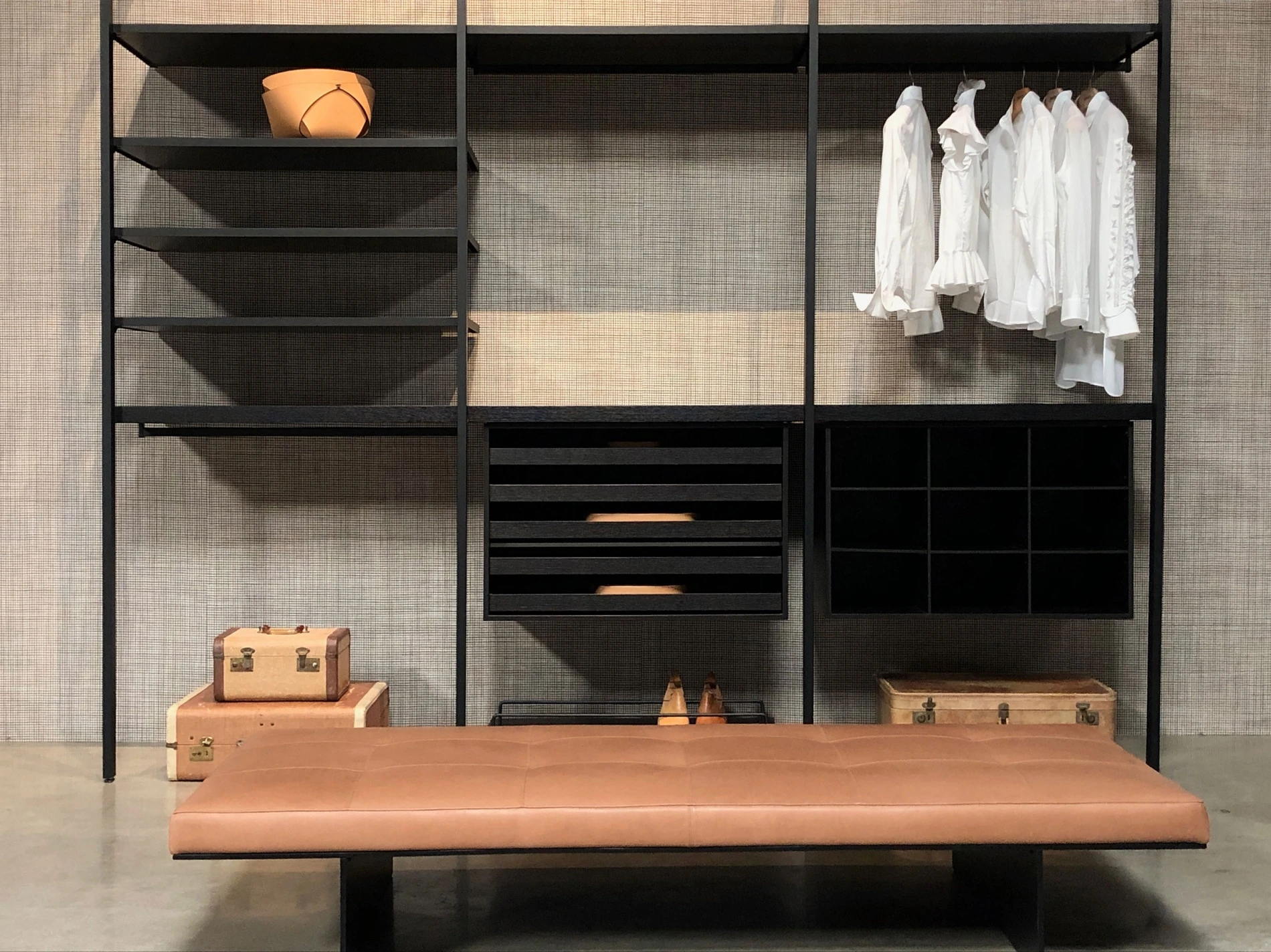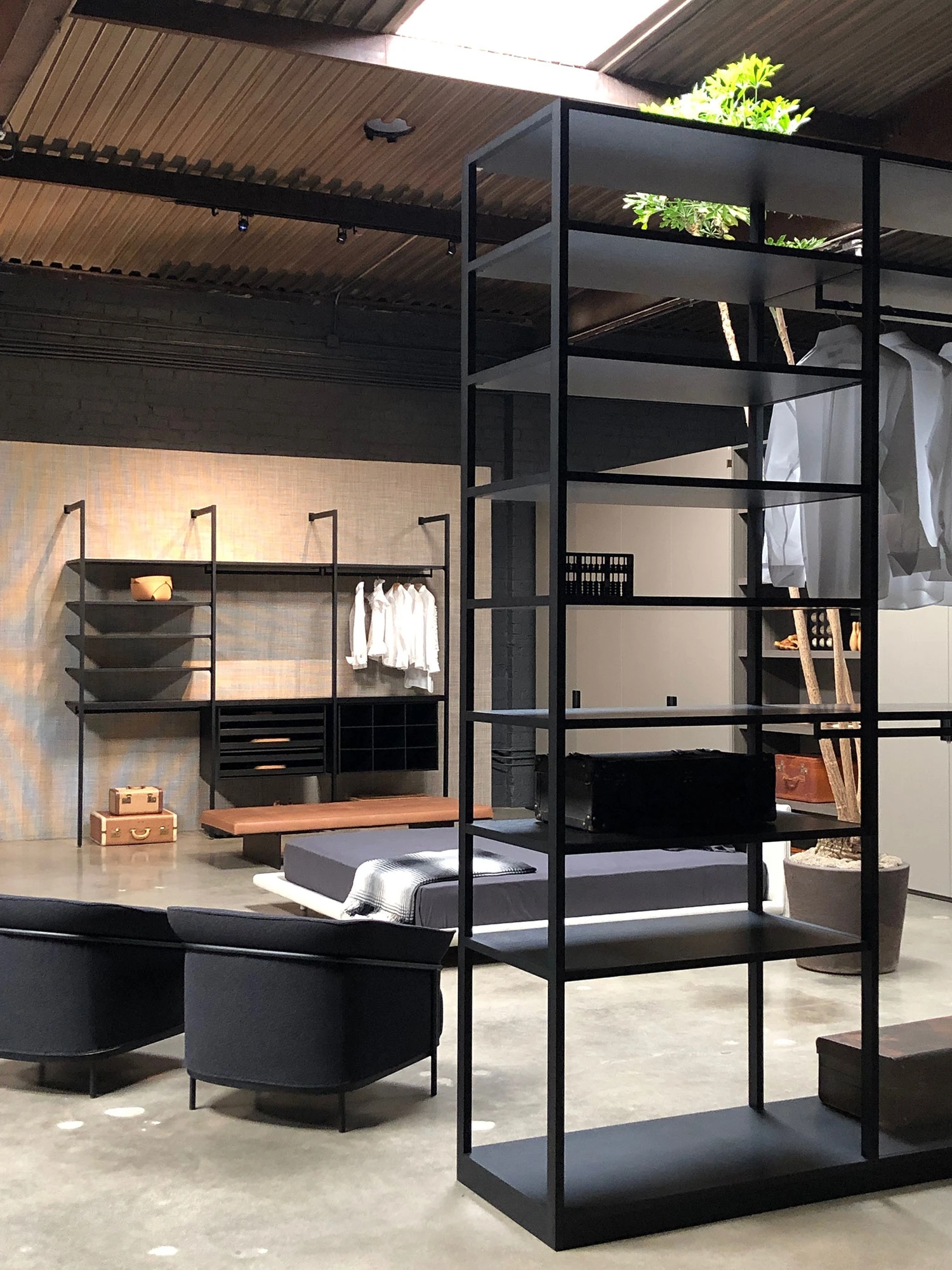 The night area exhibits a variety of solutions of Storage, Porro’s system of wardrobes, open wardrobes and walk-in closets. Holding one’s clothes and giving life to a secret room in the home, the Storage Dressing Room by Piero Lissoni + Porro Research Centre is shown in a large angular composition in eucalyptus, alternating it open modules and modules closed by Iron glass doors, leaving the interiors visible. At the center of the wardrobe, the Hub central drawer unit by Gabriele and Oscar Buratti offers wooden and glass drawers with a sit-bench solution in saddle leather: a place where to calmly contemplate the wardrobe, the heart of the home and a must-have among Porro’s offerings. Another dark Storage Dressing Room by Piero Lissoni + Porro Research Centre alternates the shoe rack with bright inclined shelves, the open corner and modules closed by Block doors. In the bedroom a Storage walk-in closet is a perfect grid on the fabric covered wall. The soft shapes of Kite armchairs by Gamfratesi are near a Storage Air self-standing walk-in closet. The Hinged Storage wardrobe bears thick 32S tortora lacquered doors with new built-in metal handle with leather covering, narrating the story of Porro’s meticulous attention to each small detail. The niche and the shoe rack in cenere hemlock complete its soft look. Boutique Mast, the newest addition to Porro’s walk-in closet systems, shows glider-wing cantilevered shelves in burnished brass matched with wooden elements.