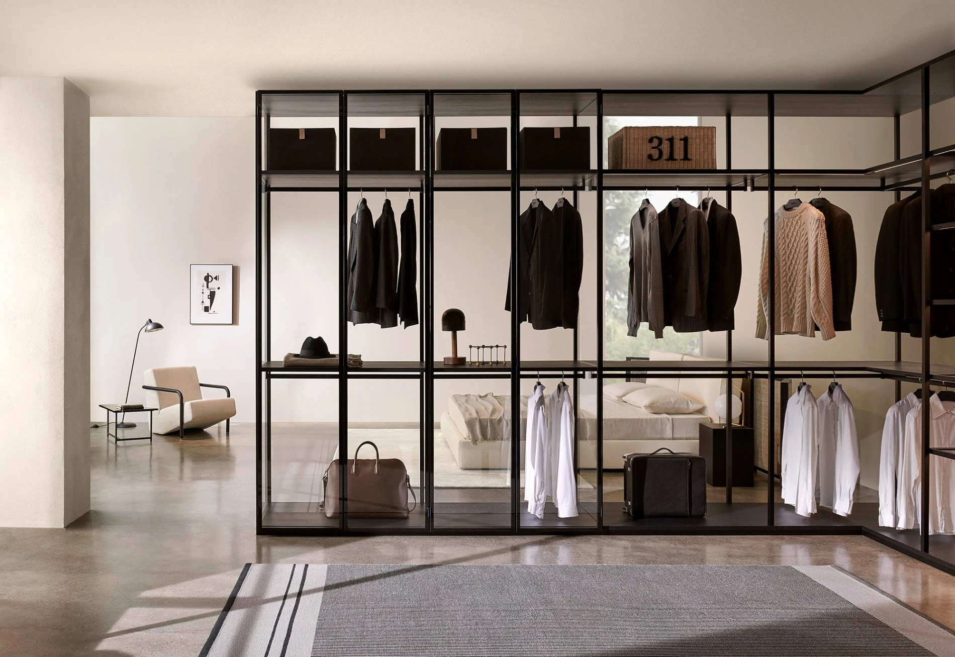 The Storage system of wardrobes and walk-in closets, designed by Piero Lissoni + CRS Porro, defines a transparent internal path, equipping the space and letting the light filter.