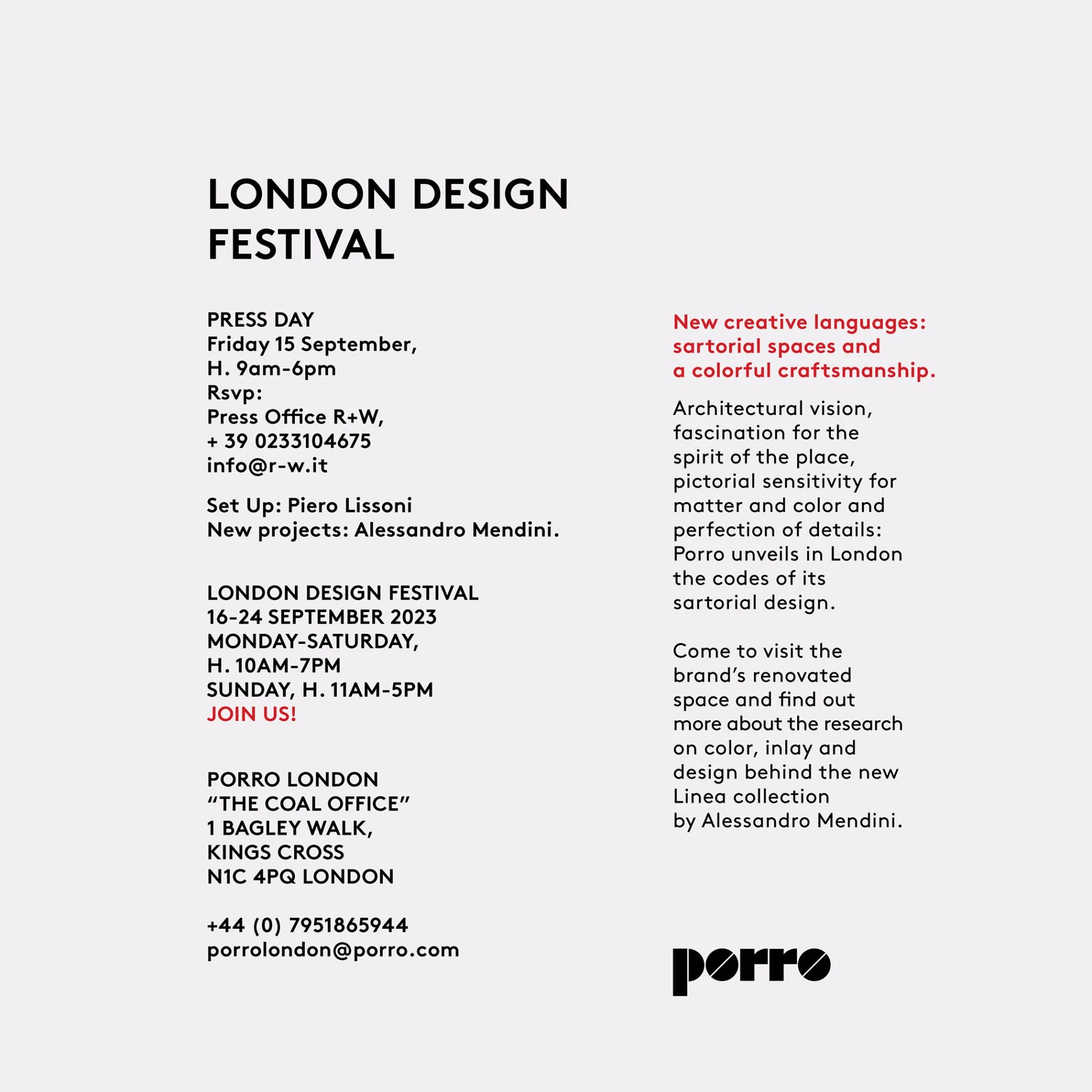 PORRO LONDON, THE COAL OFFICE, 1 Bagley Walk Kings Cross, N1C 4PQ, London