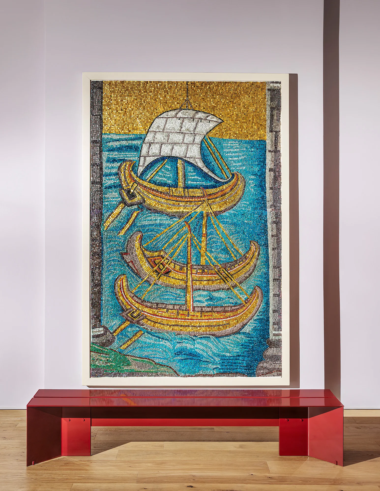 Finally, in the secretarial area of the Ambassador and the Minister, the Origata bench in a vivid China red finish is positioned before a glass-paste replica of the Byzantine mosaic from the Basilica of Sant’Apollinare, crafted by the Mosaicists Group of the Ravenna Academy of Fine Arts — expressing, through diversity, a shared commitment to craftsmanship and material refinement.