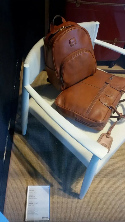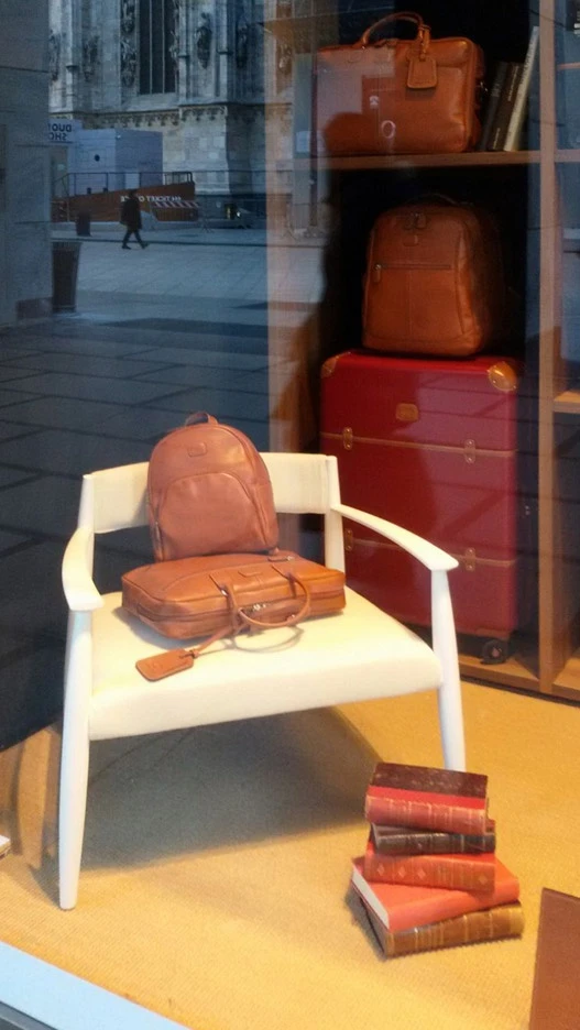 Bric’s Milano chose to personalize its shopping window at La Rinascente Milano Piazza Duomo, on show from 19 to 25 January 2016, with the Ghiaccio armchair with white stained ash structure and cream-coloured fabric seat, the Shadow Light hanging lamp and the System bookcase in heat treated elm: 3 Porro icons for a refined and natural interior, ideal background for the bags and suitcases of the brand.
