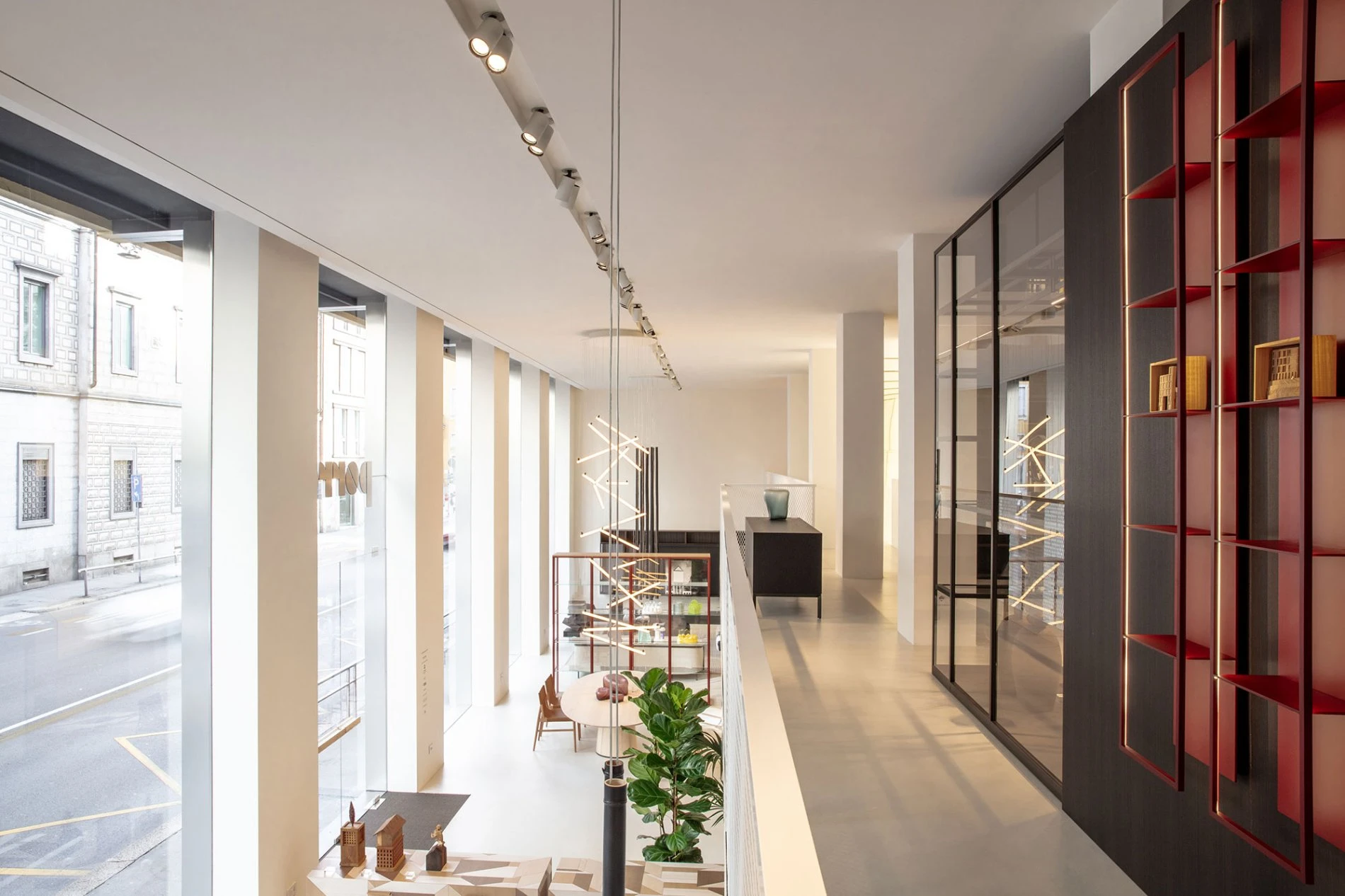 Piero Lissoni's architectural project transforms the new showroom into a pure and linear white box, a conceptual place where things happen and whose six windows become like monitors over the city. The space is spread over two floors with a mezzanine on the first floor. The stairwell becomes the centerpiece of the space: a parallelepiped whose walls are covered with full-height mirror with a backlit opaline back. The suspended white sheet metal staircase is like an origami ribbon. On the second floor, the white expanded metal parapet defining the limits of the mezzanine maintains transparency by making the spaces dialogue.