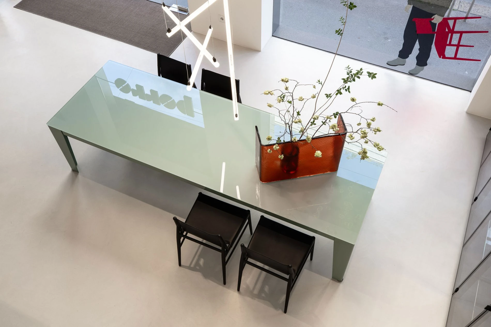 The journey begins in a striking double-height dining area, where visitors are welcomed by Tablo, the new table by Piero Lissoni. A minimalist statement with unexpected nuances, it features a glossy verde gris metal structure paired with a back-painted verde cardo glass top – an elegant optical interplay the recalls the delicate chiaroscuro of nature.