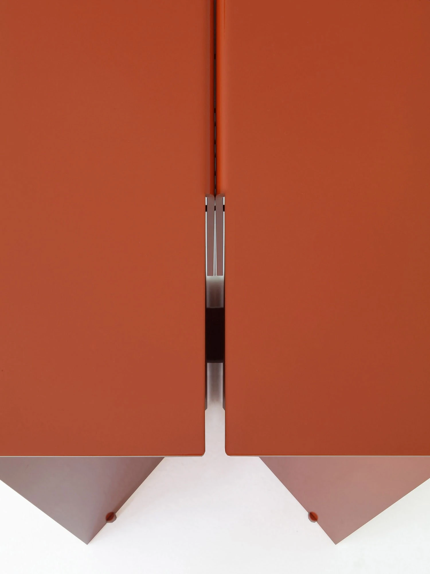 The Origata consolle showcases a monolithic design, drawing inspiration from the art of making kimonos, the traditional Japanese garment. Similar to how kimonos are crafted from a flat, rectangular fabric that is cut in straight lines and sewn together to minimize waste, this furnishing is created from a single sheet of aluminum that is cut and assembled using screws, maximizing the use of material.