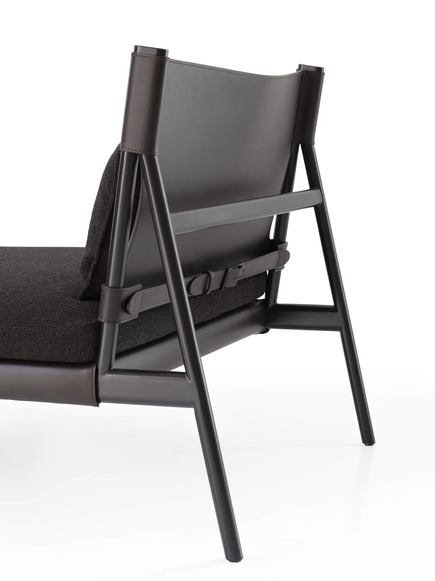 Finishings. Structure in black varnished metal; back and seat in saddle leather in the colours of the collection; cushions in fabric.