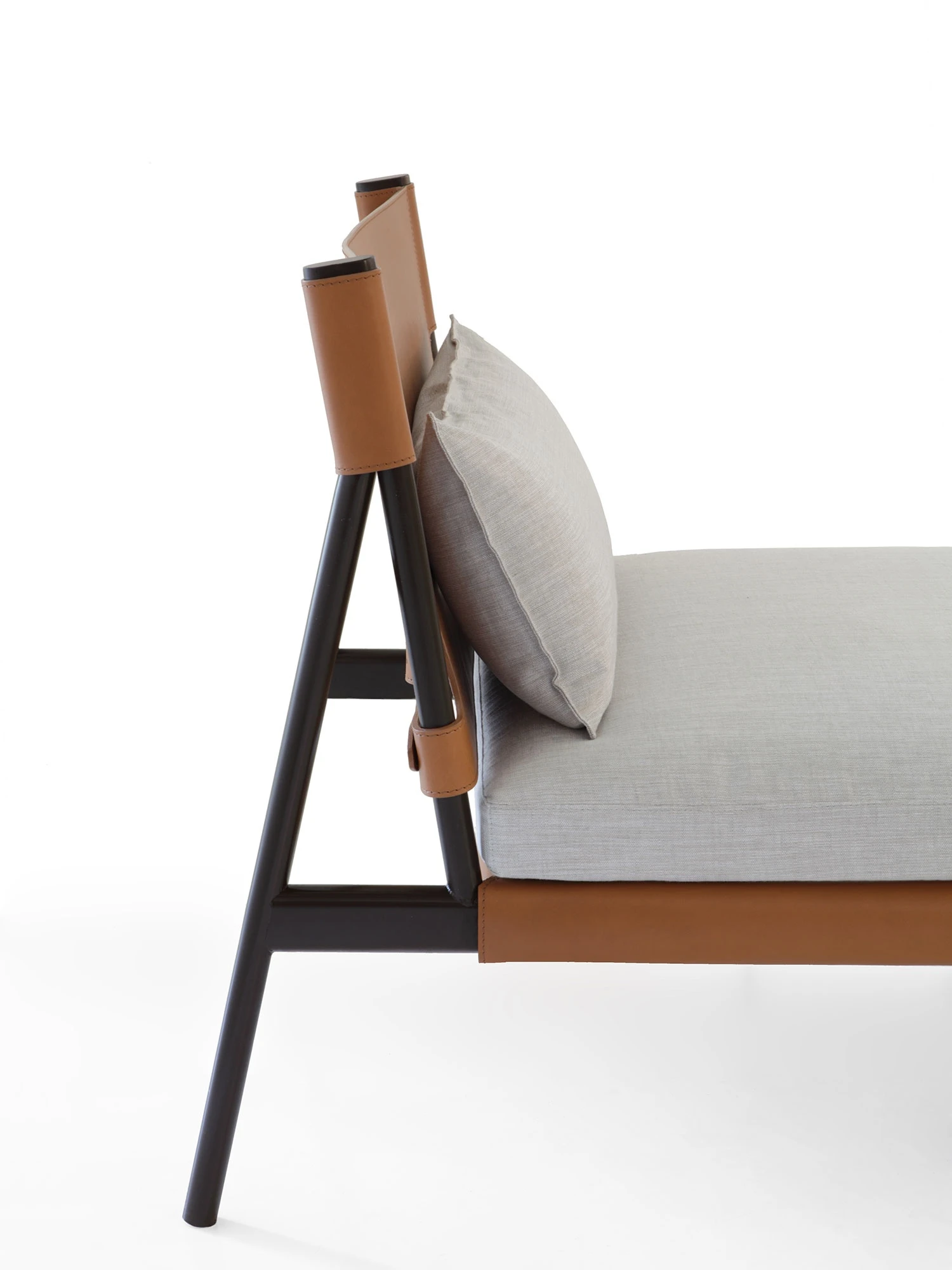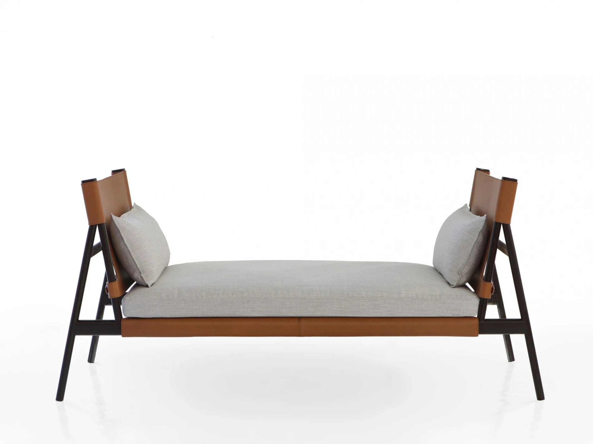 Standing out for a trestle structure in black painted metal, Traveller is an elegant and original daybed. The back support is provided by side backrests in leather with a “saddle effect”, robust but softened by the presence of a mattress and two cushions covered in fabric, leather and eco-leather, totally removable.