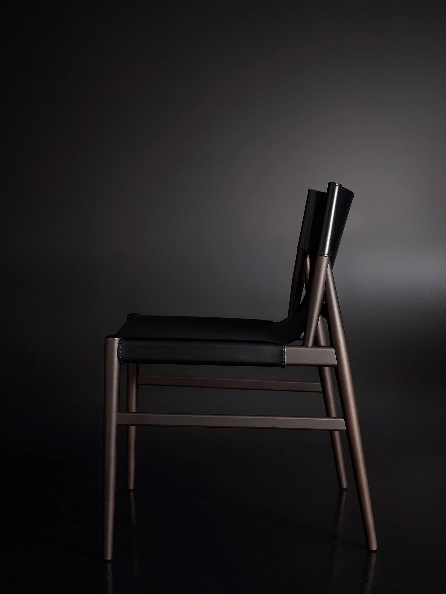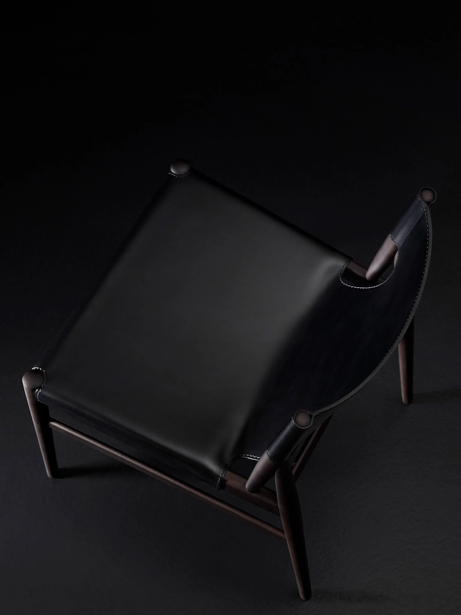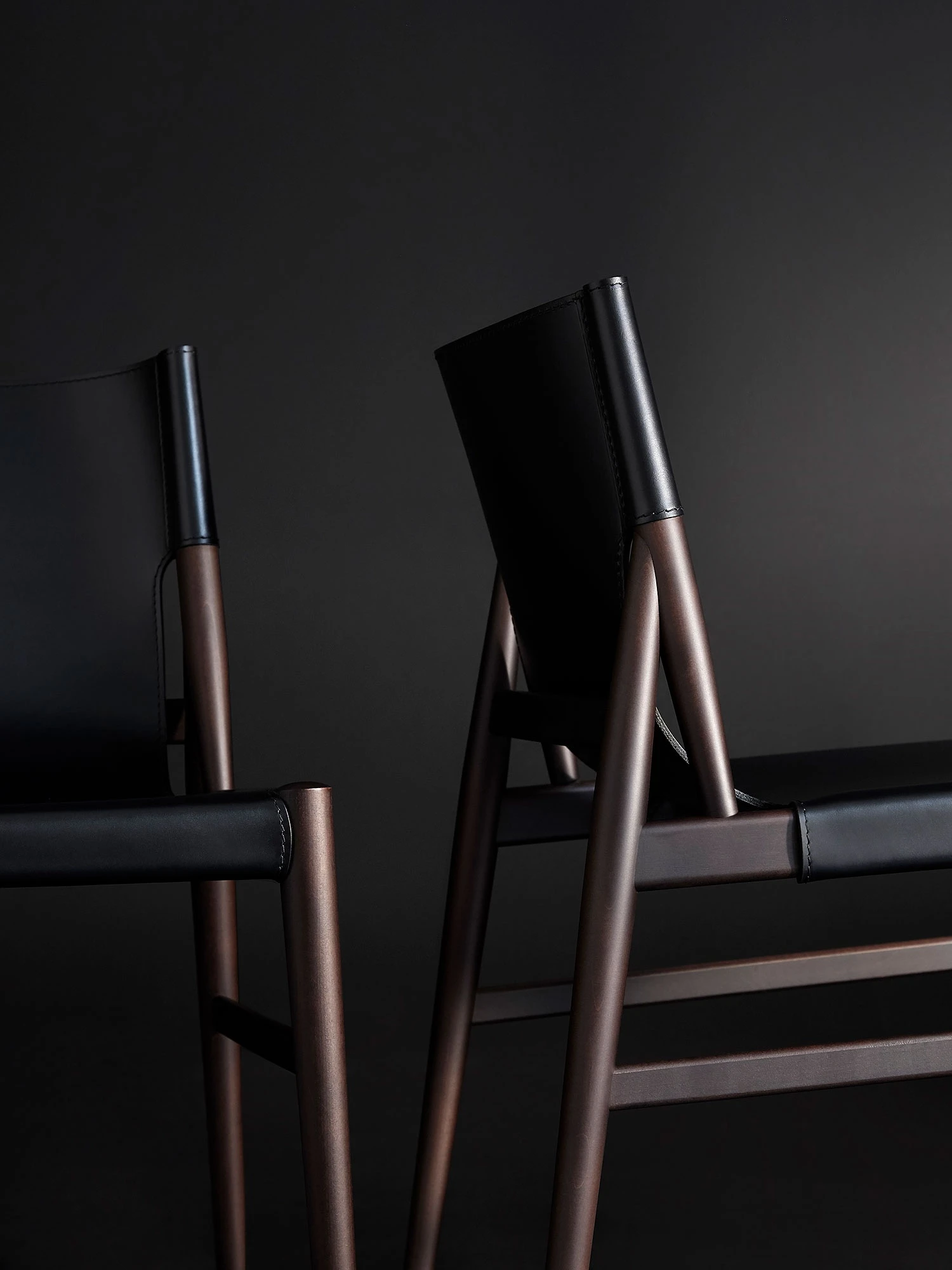 Finishings. Structure in natural, black stained or brown stained maple solid wood, seat in saddle leather in the colours of the collection.