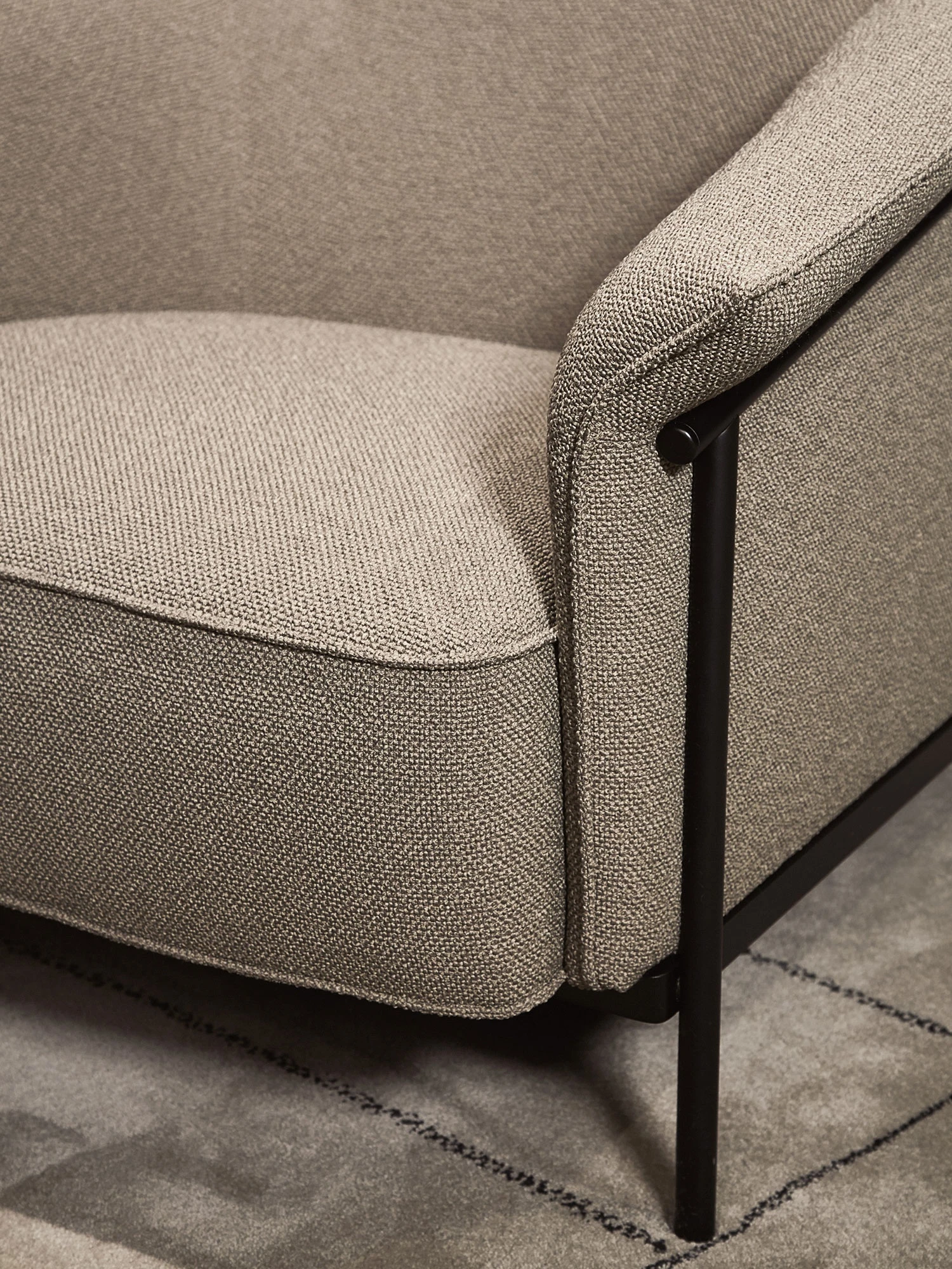 A new classic, soft but also generous, the Kite armchair is characterized by its evergreen look and its timeless charm. The metal structure is a set of curved lines into space, while the internal padding recalls the shape of an enveloping coat with a folded collar, creating an inviting arm support.