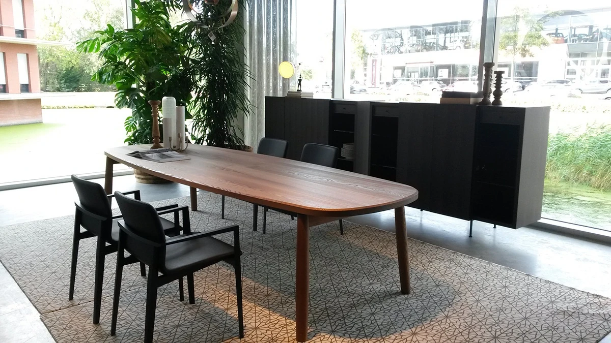 In the dining area, the organic lines of the new Galileo table in heat-treated ash, thanks to the oval top in solid wood standing on thick tapered legs, come with the thin Garda armchairs with a black-stained ash structure and an enveloping shell covered in black leather. The Tiller cupboard in eucalyptus is presented in its higher version, with interiors including two crystal shelves, to which 1 to 4 more drawers can be added.