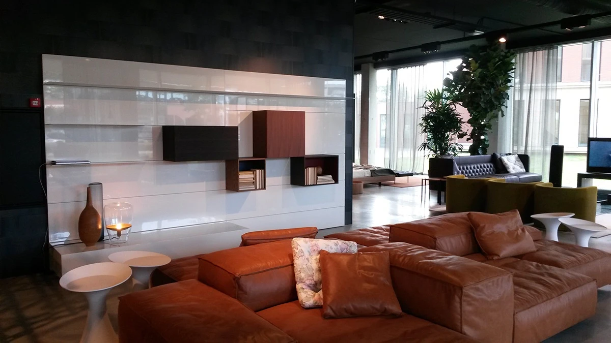 Porro conquers a new prestigious showcase in the Netherlands. Noort Interior, 1.300-sm refined showroom located in one of the most famous tourist locations in the Netherlands, Noordwijk, renews its exposition dedicating an entire area to the joint proposal Living Divani and Porro, as a symbol of design excellence and elegance by Piero Lissoni, the iconic Italian design architect, art director and main designer of both brands. The dining room, the sleeping area and the dressing room entrusted to Porro alternate to relax areas Living Divani, completed by Porro systems for the living zone, recreating the idea of a big house in a tropical setting where primary colours mix up with the chromatic vitality of wood, spreading intense notes of elegance, refinement and relax. The première of the new area, set for 10 October from 8 pm to 11.30 pm with Piero Lissoni as special guest, included the opening of the exhibition by Dutch painter Marcel Bastiaans, whose abstract, colourful paintings are freely placed on walls to complete the settings of Living Divani and Porro, converted into the house of a refined art collector.