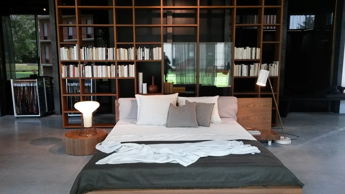 The bedroom stars the new Taiko bed, a unique blend of rigorous geometry and an inviting softness, with a wooden bedframe and wide feather back cushions. Taiko comes with the trusted Butler, a cylindrical wooden bedside table, which presents a grooved tray on top that enhances the objects placed upon it. On the background an impactful System bookshelf in the new reduced depth of 23 cm, that runs full-length from the floor to the ceiling, placing all bets on the strong tactile impact of its finishing, the teak, a warm wooden essence that varies from pale yellow to bronze with hints of red. In order to protect some of its sections, two-sides glass hinged doors with Iron frames are offered; extreme transparency enclosed by an elegant metal profile.