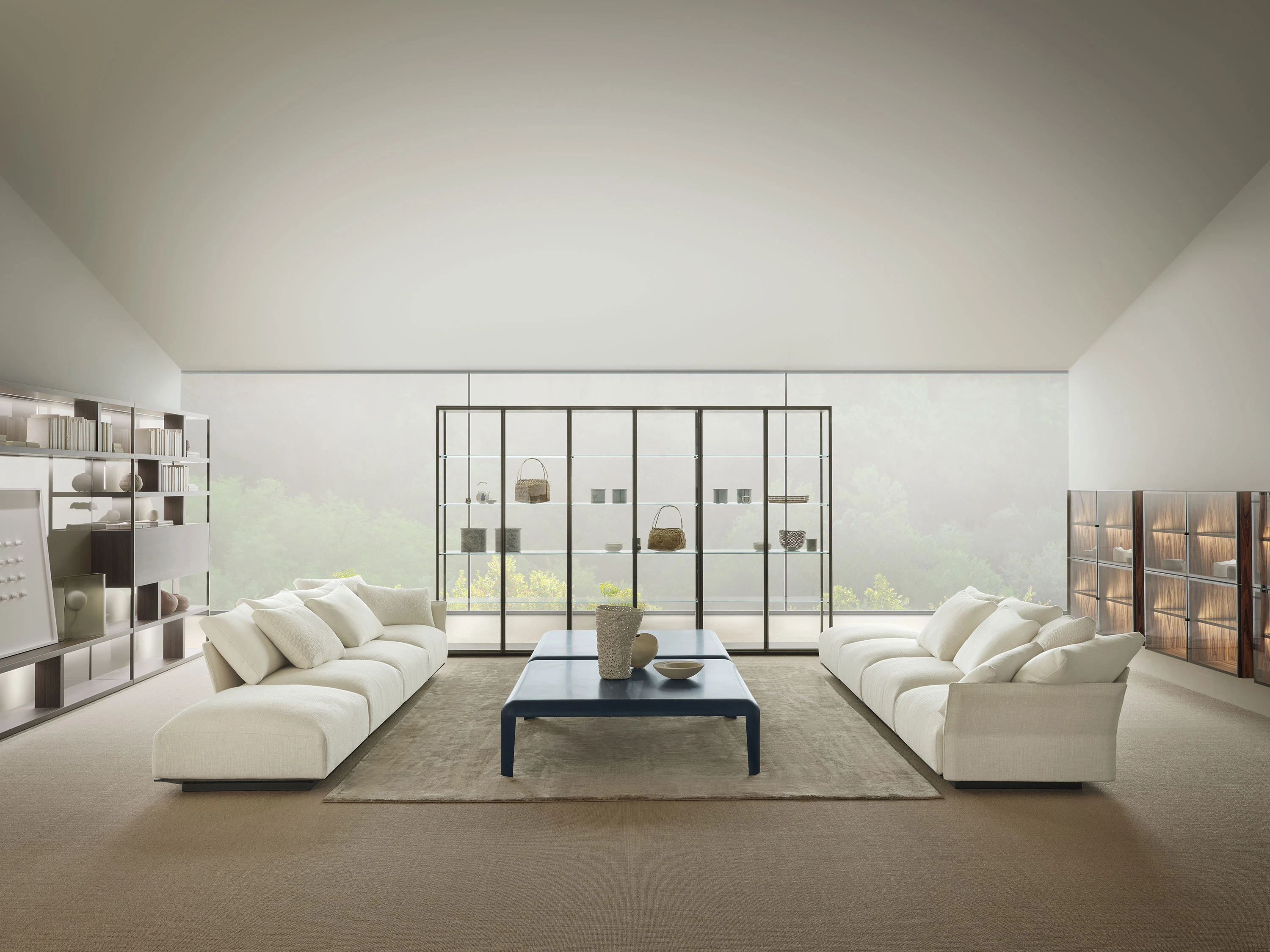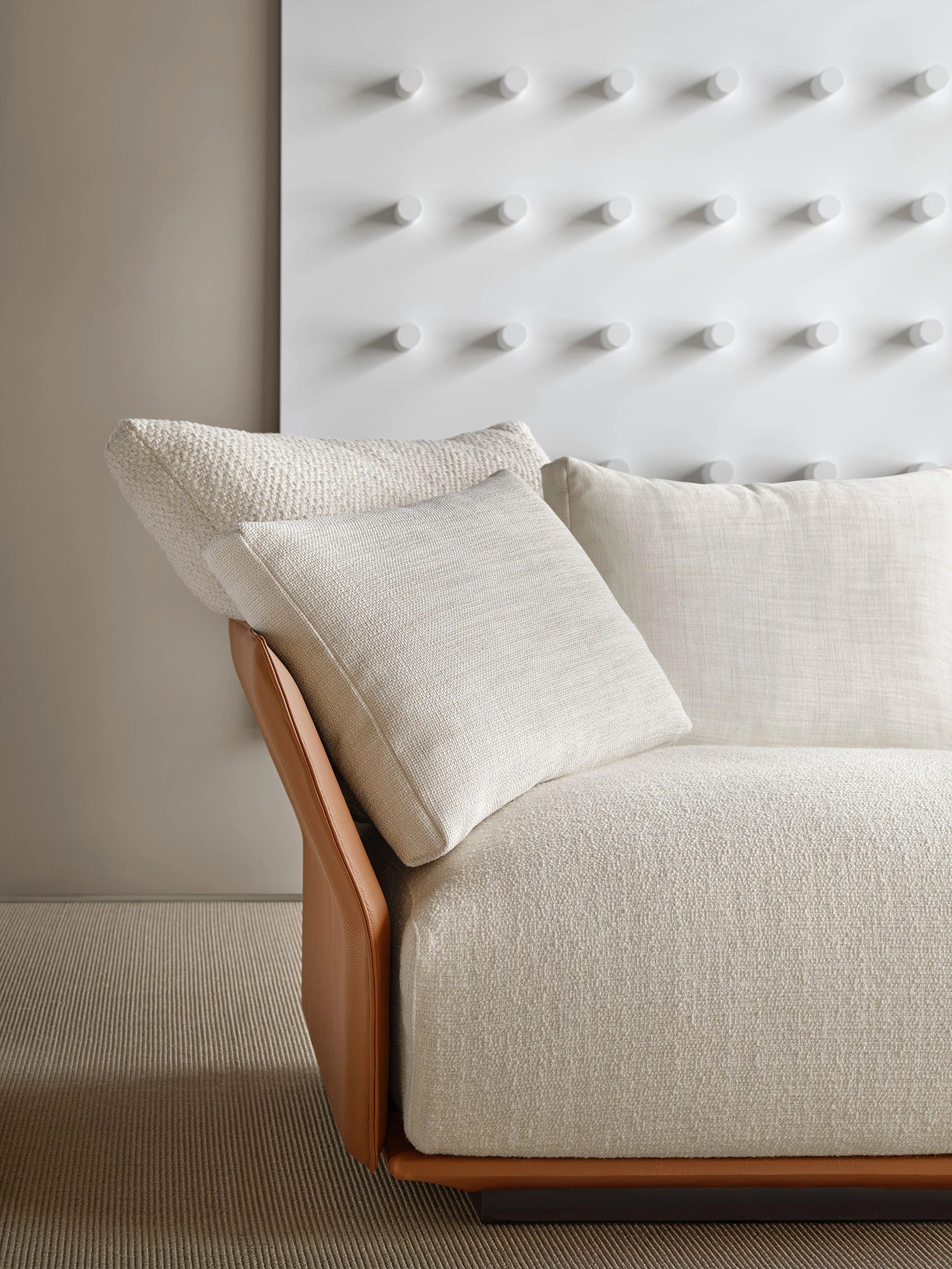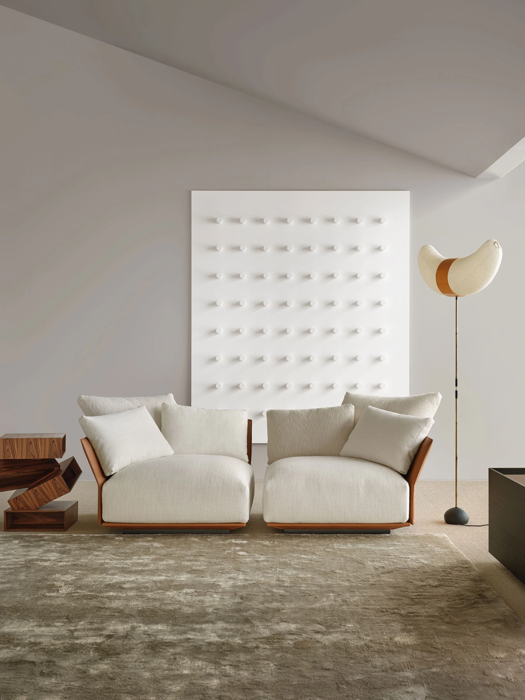 The sofa rests directly on the floor with a solid base — available in upholstered or lacquered versions — into which the distinctive wing-shaped backrests and armrests are set, clad in either fabric or leather. Slightly tilted backward, these elements define the profile with elegance and lightness, introducing a sense of openness and movement that enlivens the composition.