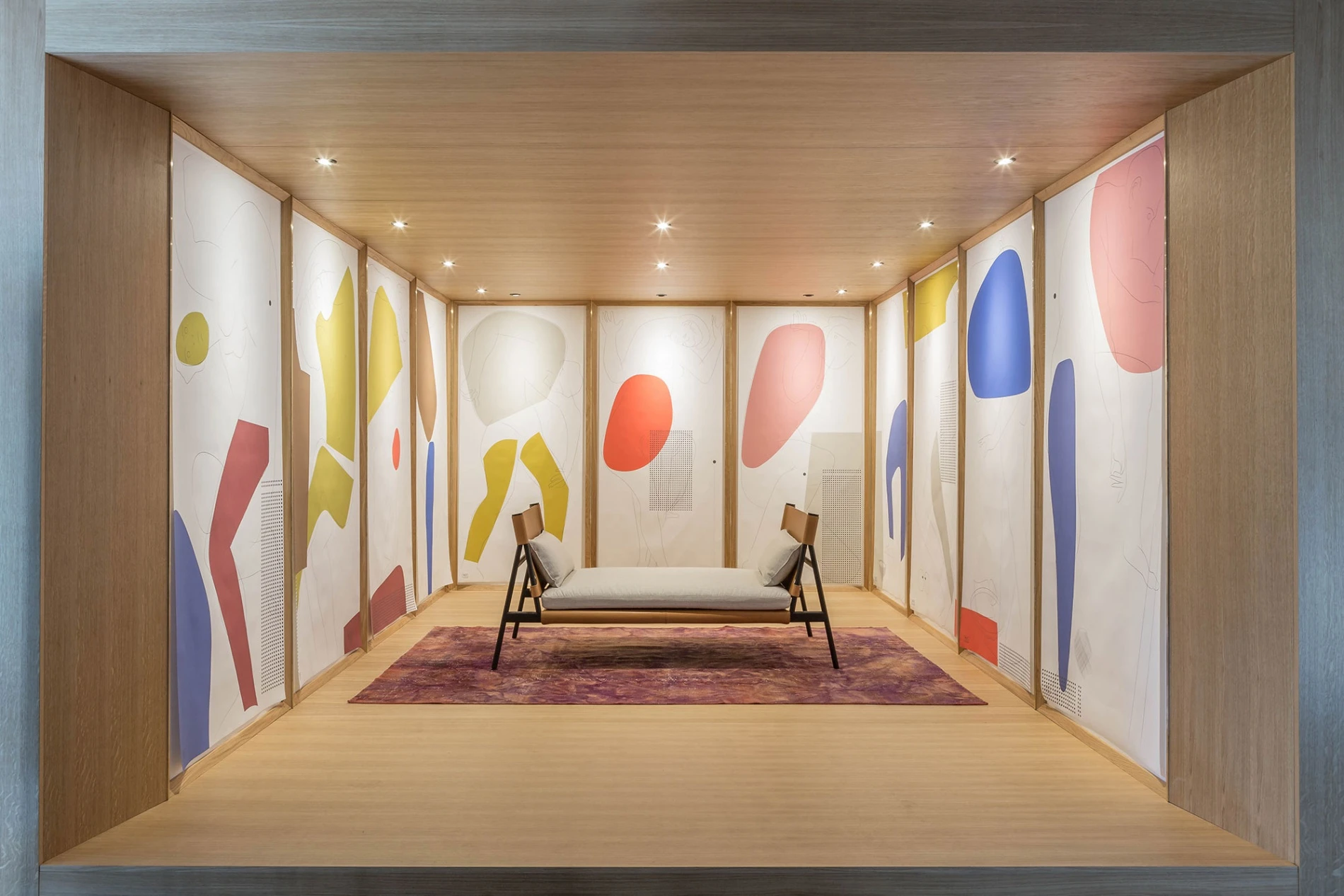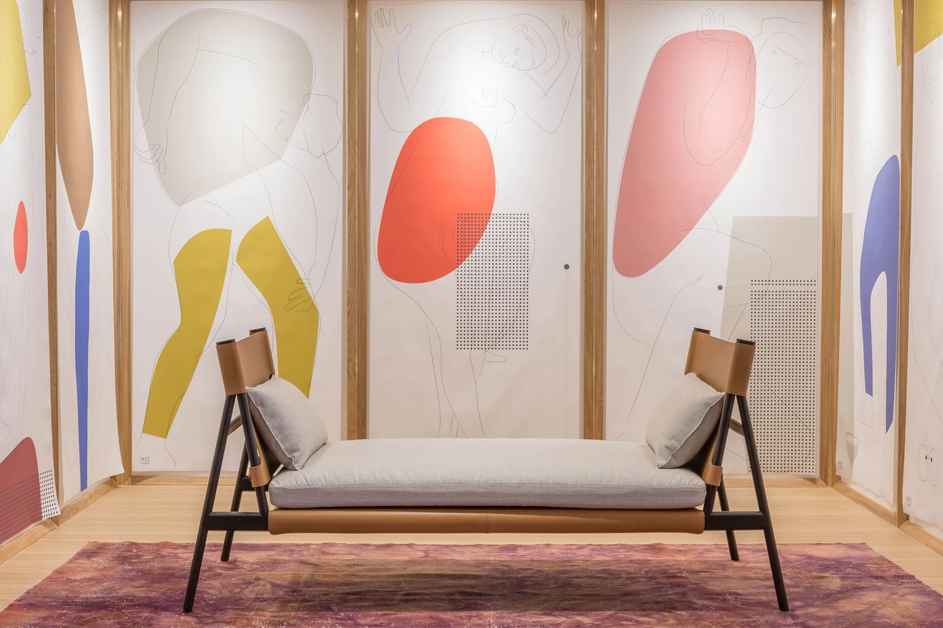The exhibition depicts an informal space, characterized by large canvases giving the room a warm and rhythmic look. At the centre the Traveller daybed, created by the strategic liason between Porro and Gamfratesi started in 2015.
