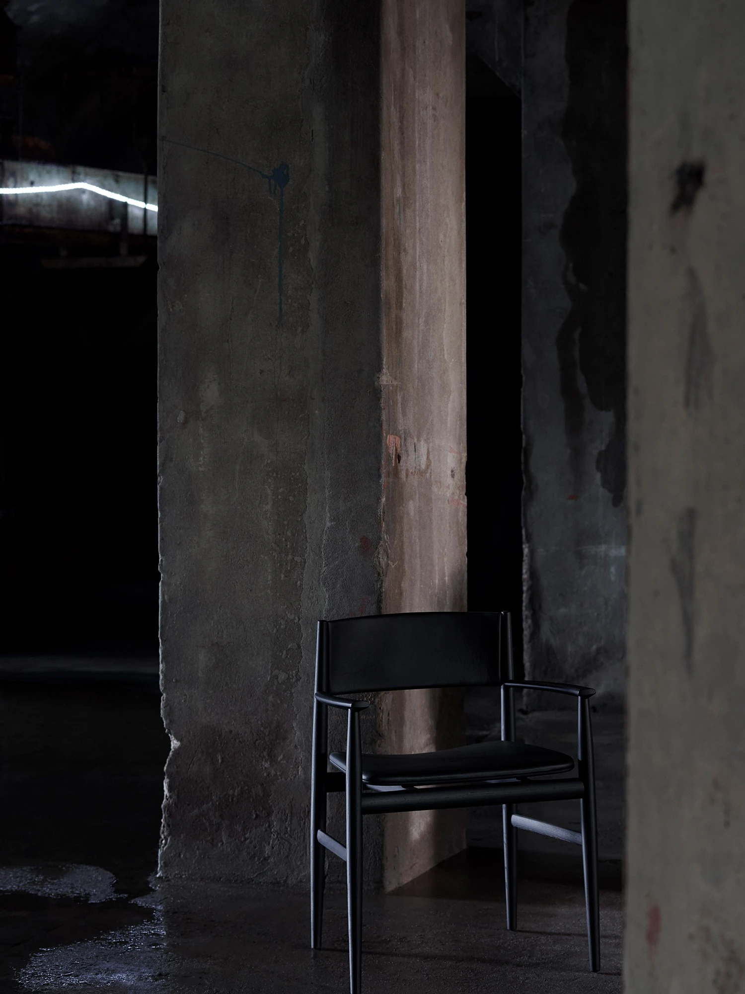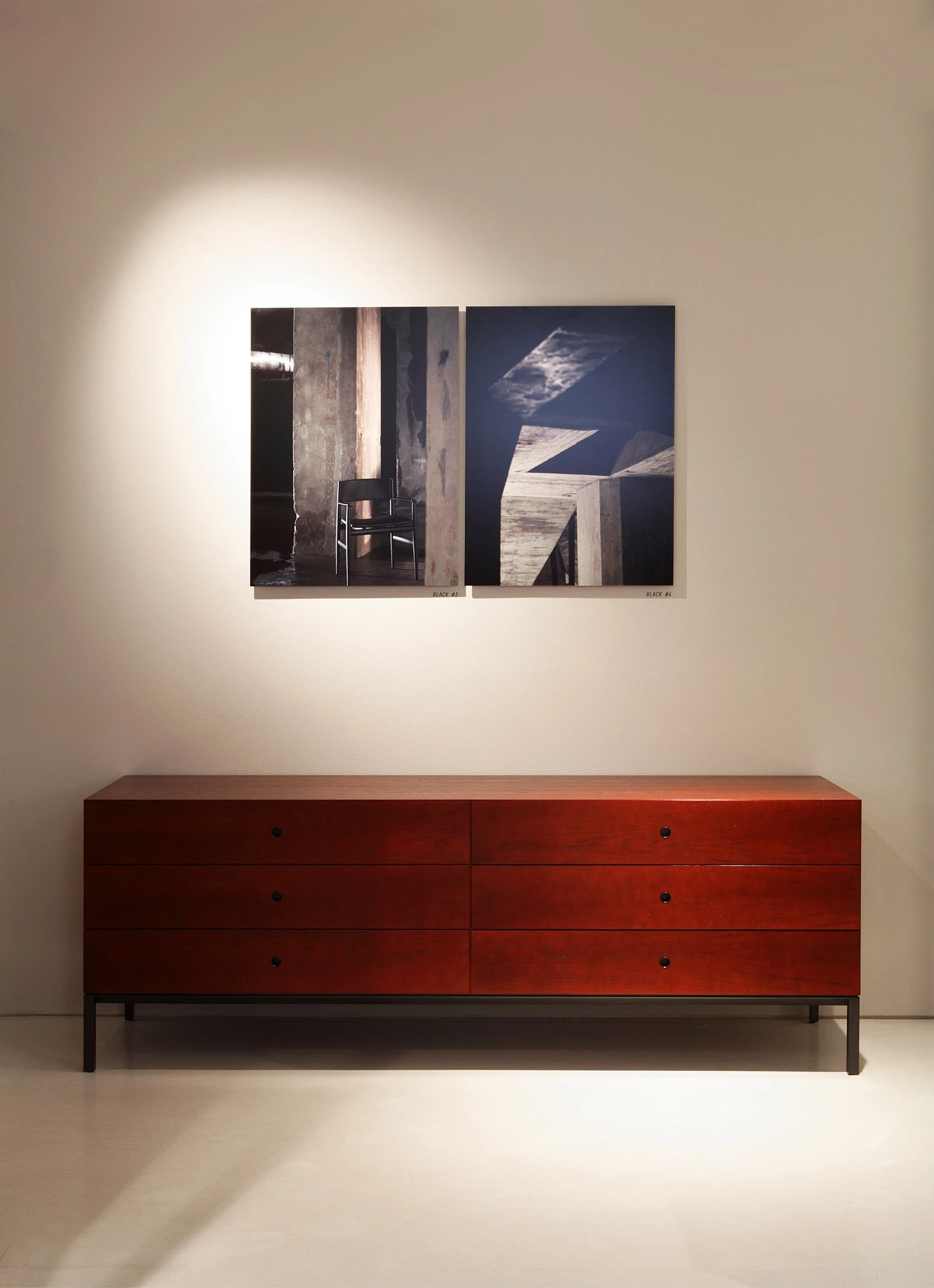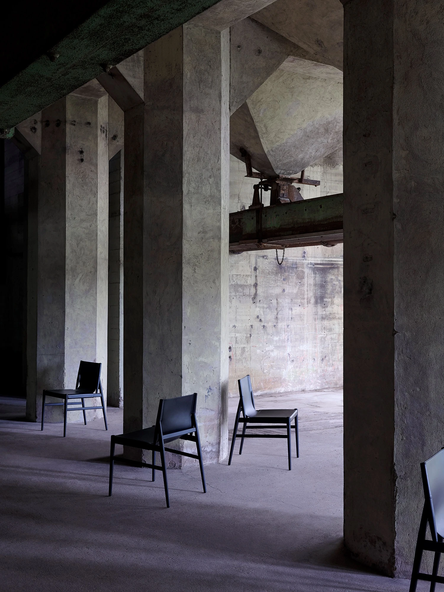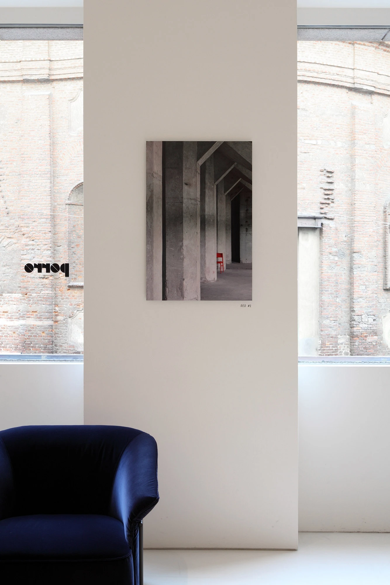The exhibition slowly unfolds across the two floors of the showroom amid cliffs, clouds, flowerpots, close-ups, art objects and industrial interiors, captured at different moments in time: a composite mix of images gathered together in a series of mood boards that tell about her fascination with landscapes, portraits, still life and architecture and her dedication to capturing their unique character every time. A thought that grows and evolves encompassing the new pictures of Porro’s products that were taken ad hoc in an old warehouse in Leiden, 30 minutes from Amsterdam, near the home base of the Polish photographer: here are the sketched lines of the Neve chair by Piero Lissoni in red stained ash wood in-between arches and pillars, along with the minimalist shape and thin thickness of the Metallico table by Piero Lissoni in a vibrant rosso antico metal finish, and the Voyage chairs by Gamfratesi with their sloping maple frame, covered with a sinuous black leather dress.