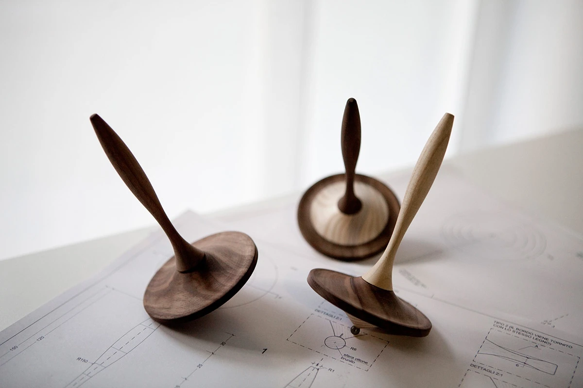 A child’s toy which is also loved by adults, universally famous, that marks the flow of time with its spins, showing new faces time after time, and enchanting with its shapes, materials and colours, to recount Porro’s life with lightness, “on tiptoe”, along the story of contemporary design and wood research which beautifies and makes the brand’s proposals unique.