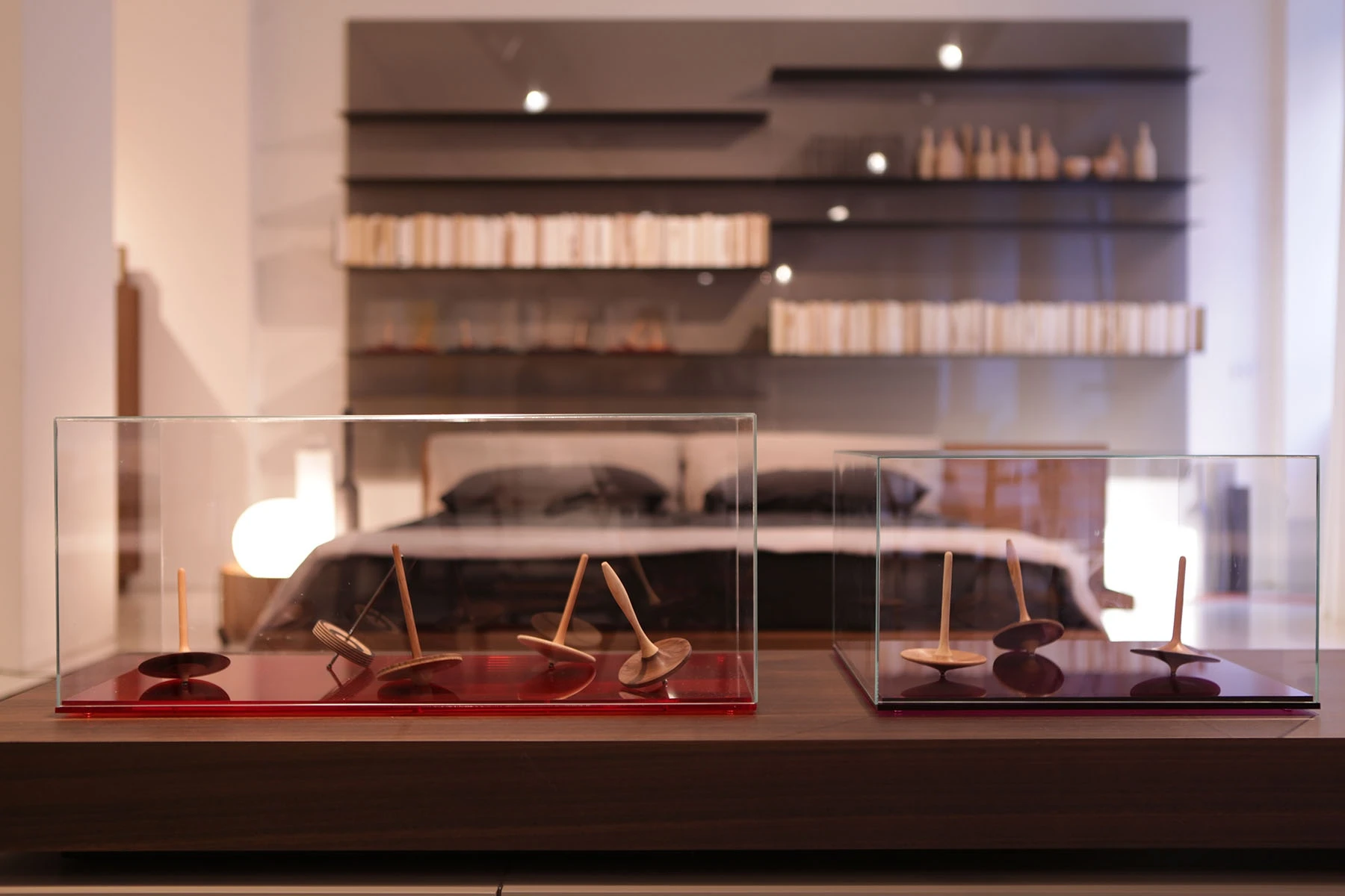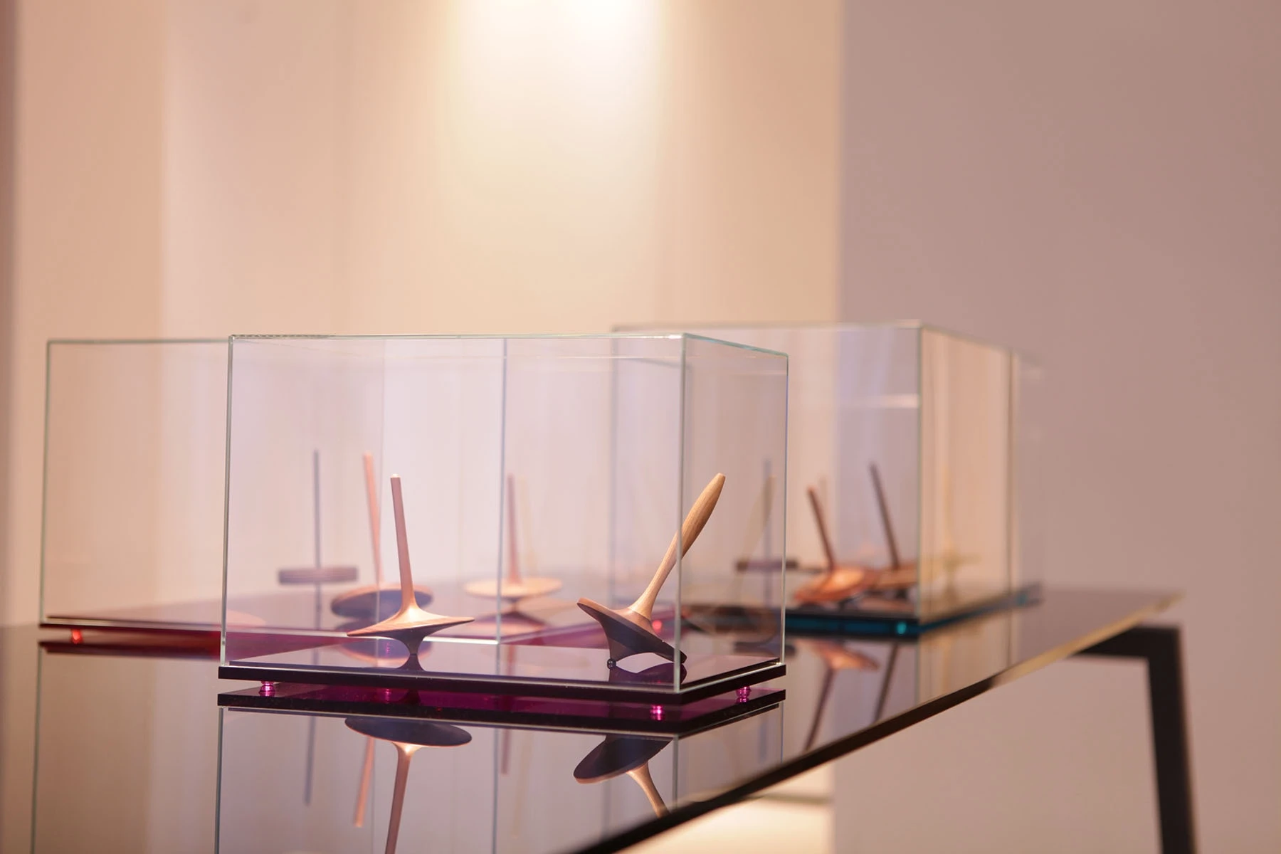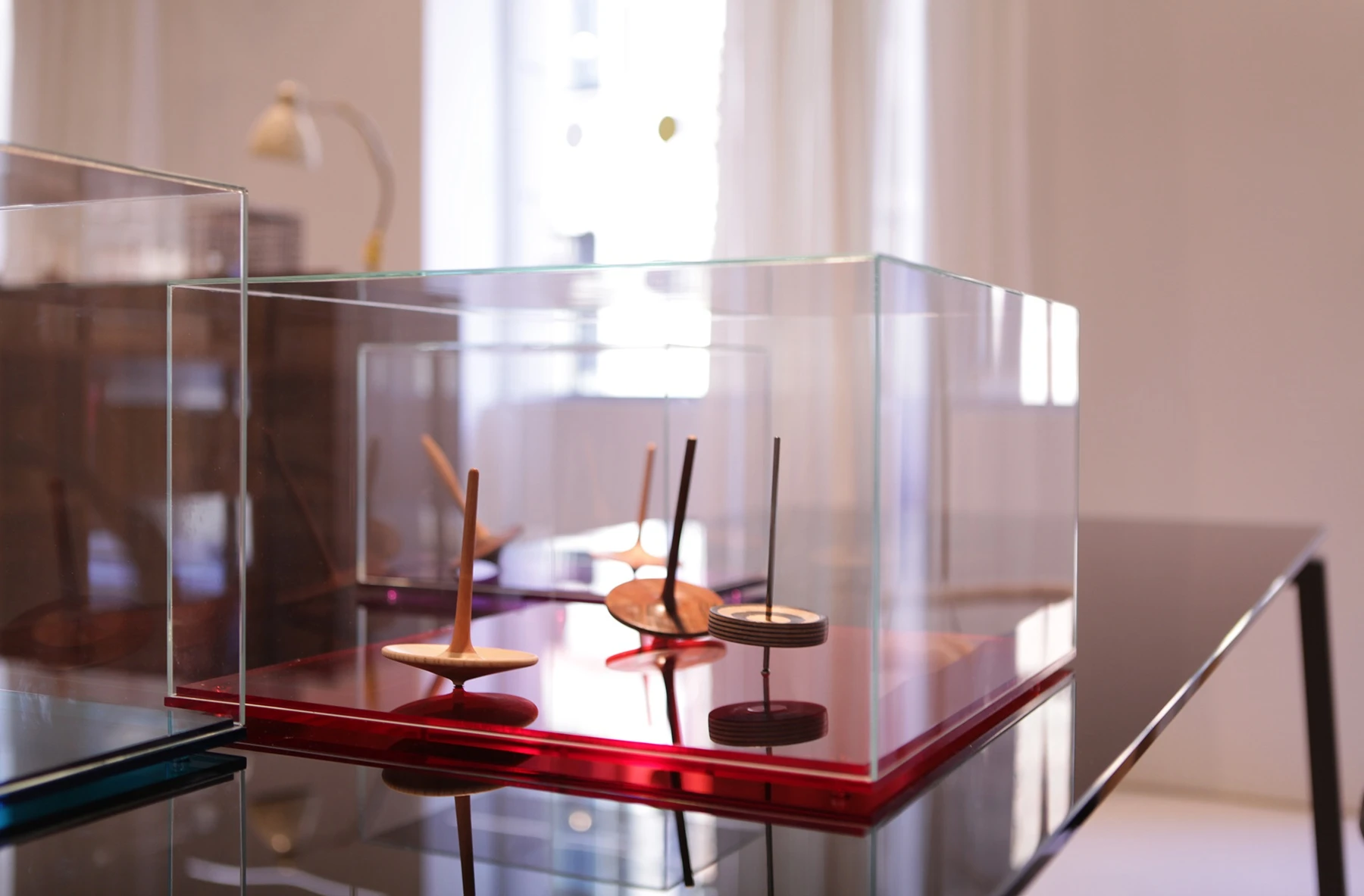 Included in 12 glass cases with a multicoloured plexiglass background, different in size and proportions, the spinning tops are freely placed in space – on the surface of the Ipe table, on the shelves of the System bookcase, on Modern suspended shelf – apparently hanging in the balance, catching an instant of their rotational movement.