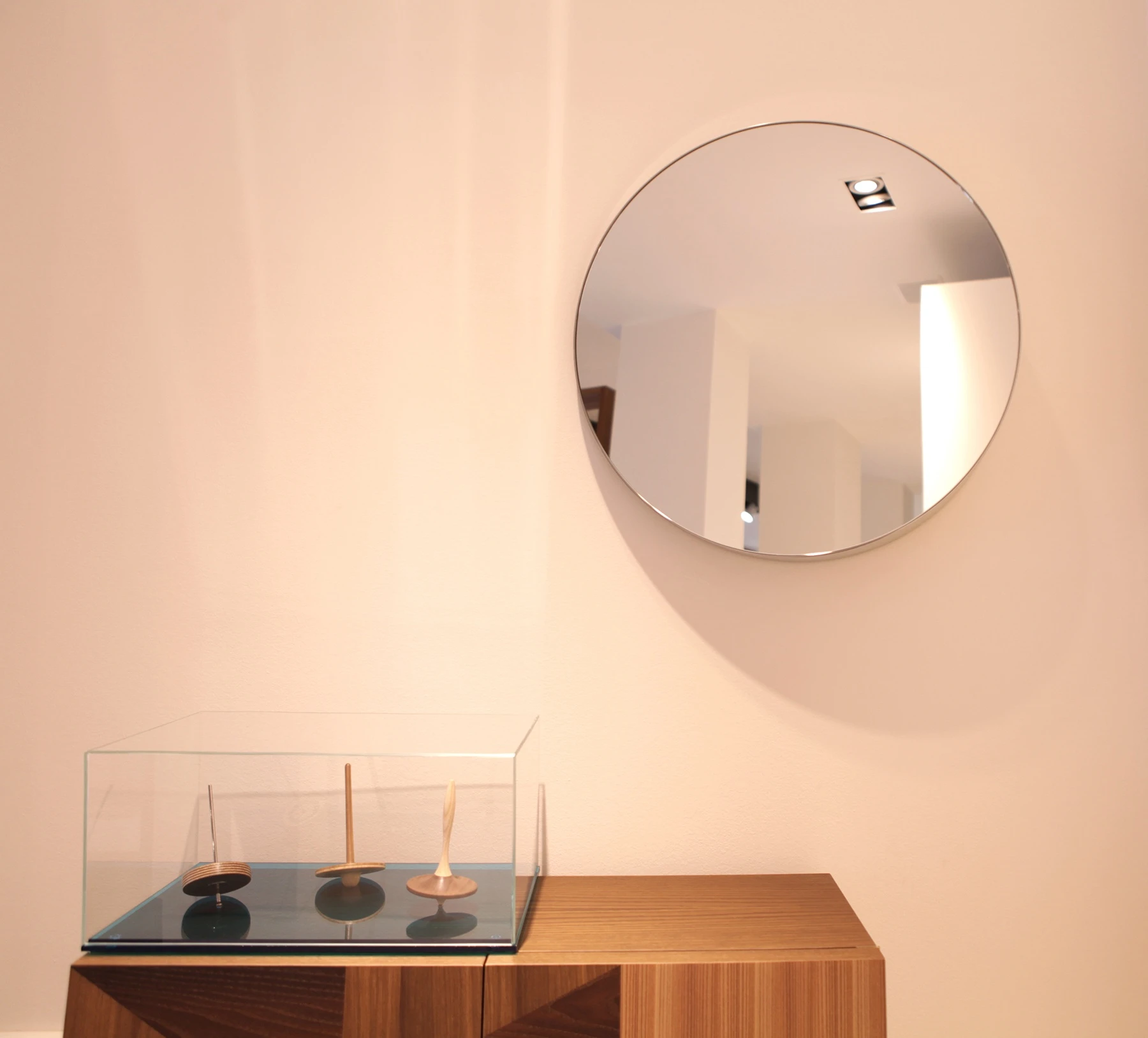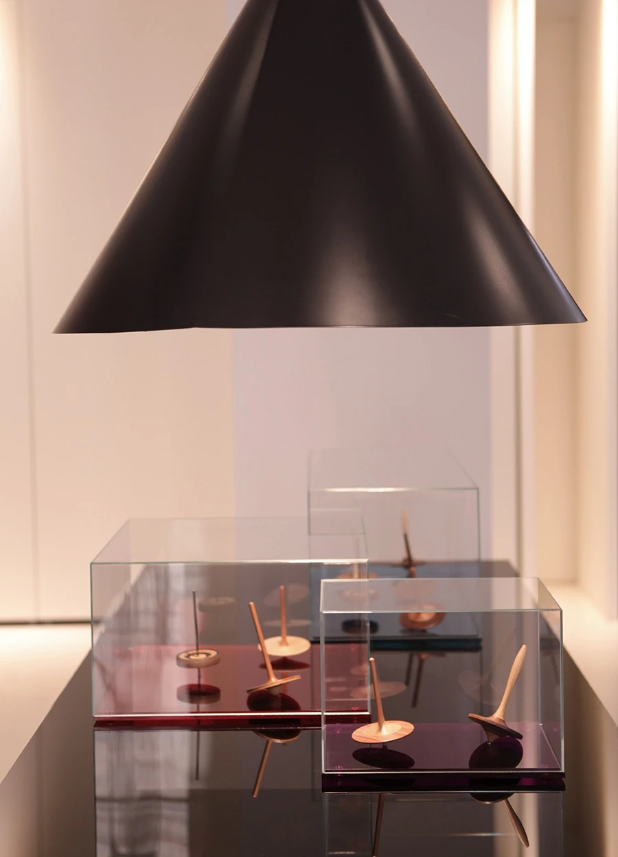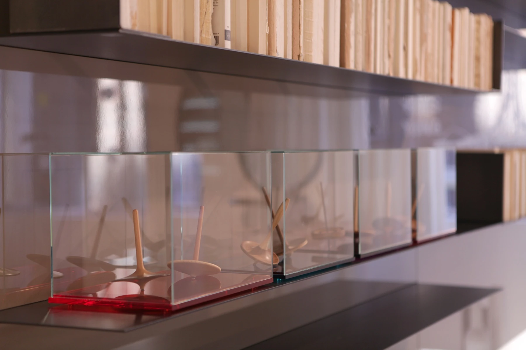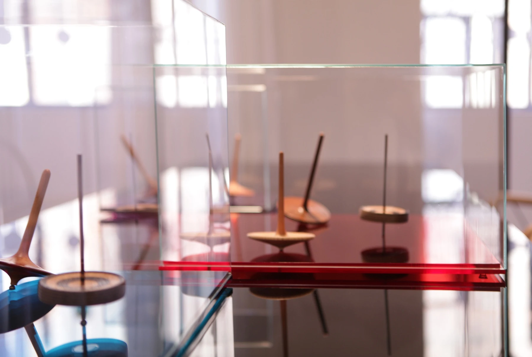 Included in 12 glass cases with a multicoloured plexiglass background, different in size and proportions, the spinning tops are freely placed in space – on the surface of the Ipe table, on the shelves of the System bookcase, on Modern suspended shelf – apparently hanging in the balance, catching an instant of their rotational movement.
