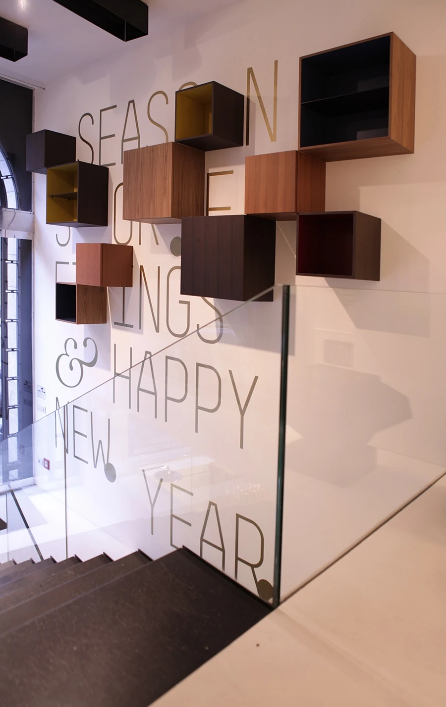 The exposition setting is Porro’s showroom set up for Christmas, whose shopping windows reproduce graphical snowflakes and the sketch of spinning tops created by Piero Lissoni, showcasing the latest products by the brand.