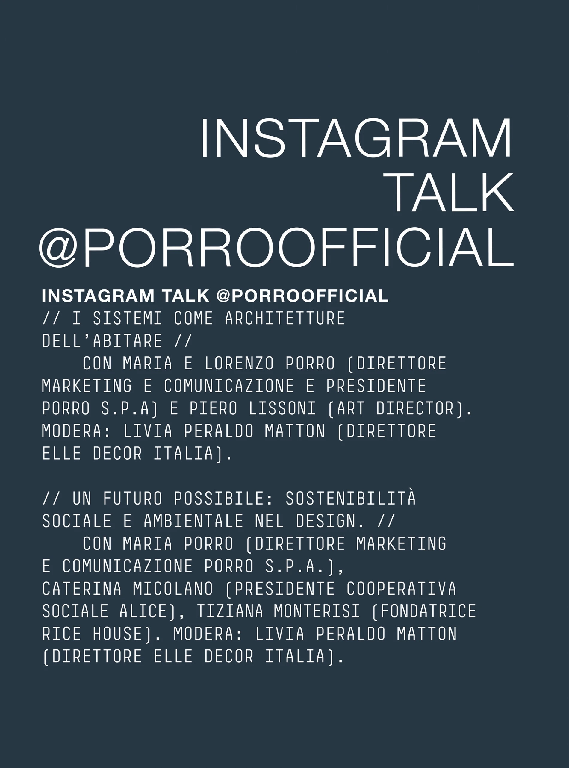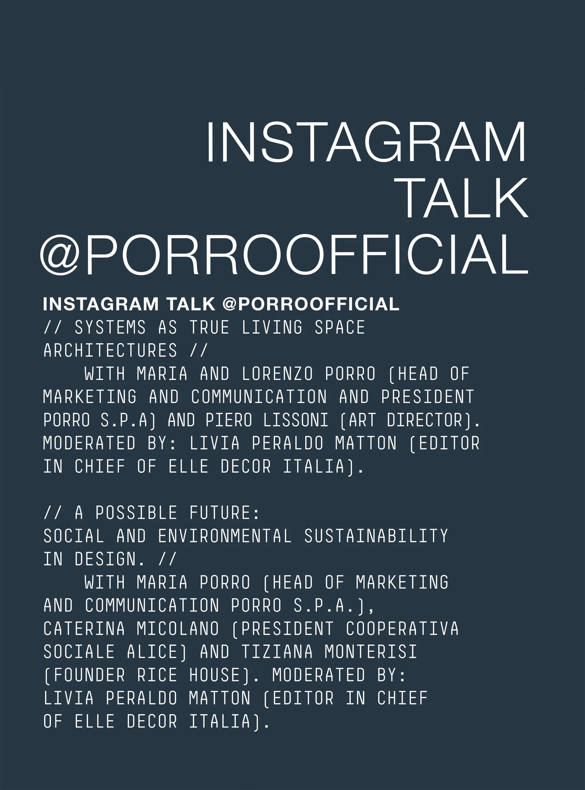 With Maria Porro (head of marketing and communication Porro S.p.A.), Caterina Micolano (president Cooperativa Sociale Alice) and Tiziana Monterisi (founder Rice House). Moderated by: Livia Peraldo Matton (editor in chief of Elle Decor Italia).
