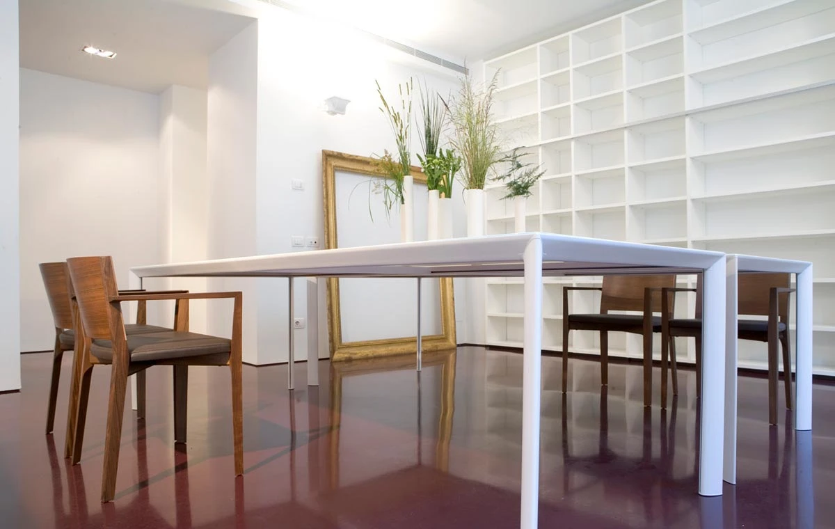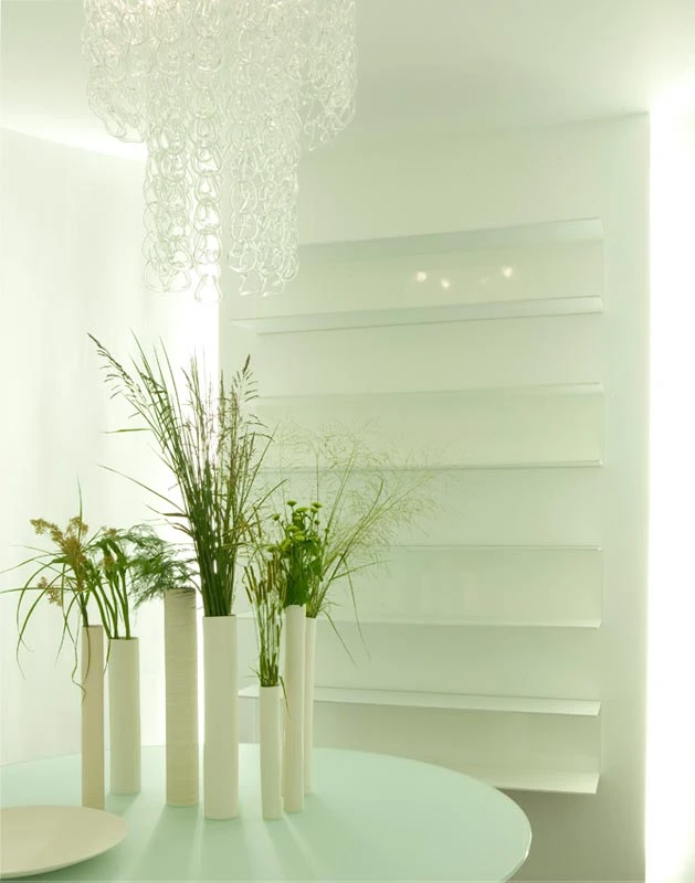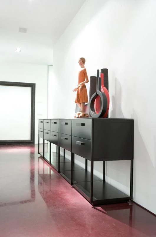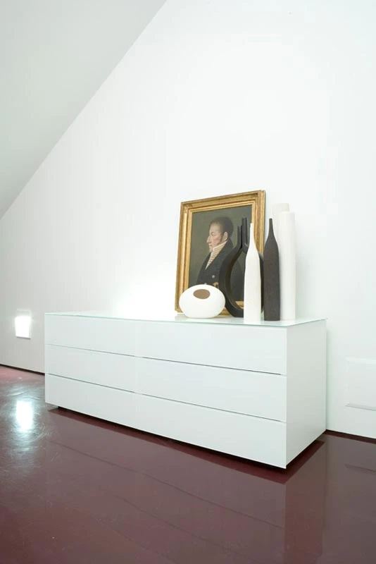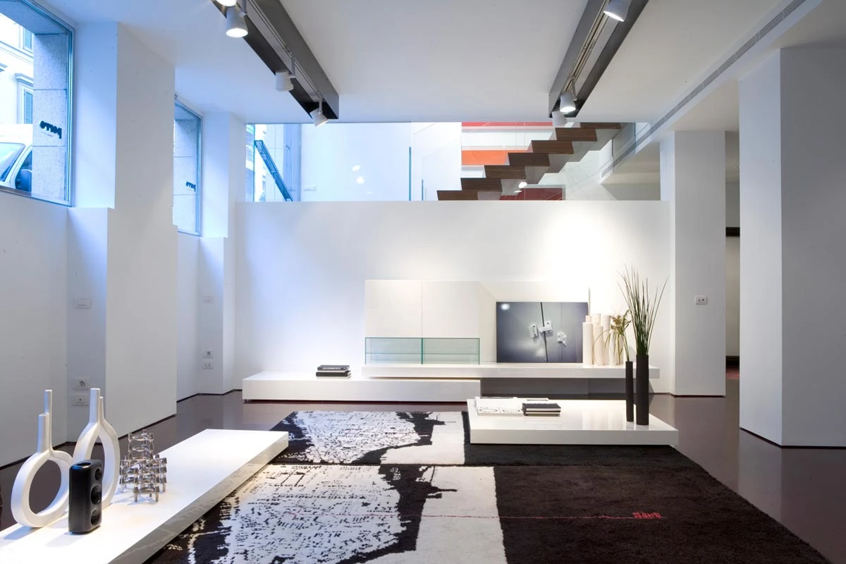 Living room mainly shows soft colours, for example chalk white of Modern system that defines spaces acting sometimes as element, sometimes as small table, sometimes as hanging shelf. Contrast is made by fire red and China red of Origami Book boxes situated on the staircase and by the 3 colours of Soho carpet.