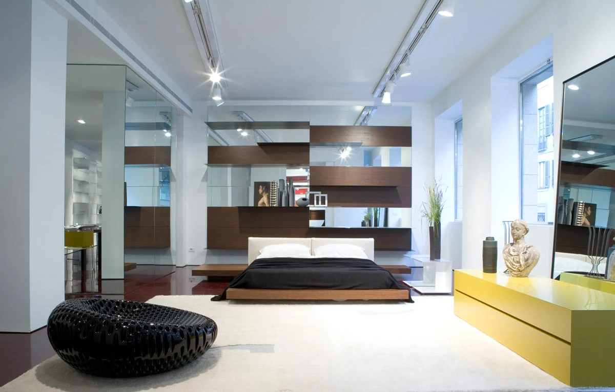 Bedroom shows mongoi finishing for Tokyo bed, Load It bookcase and Storage wardrobe, glasses and mirrors to make wide spaces, mustard colour for Unité D element and black colour for Truffle relax seat.