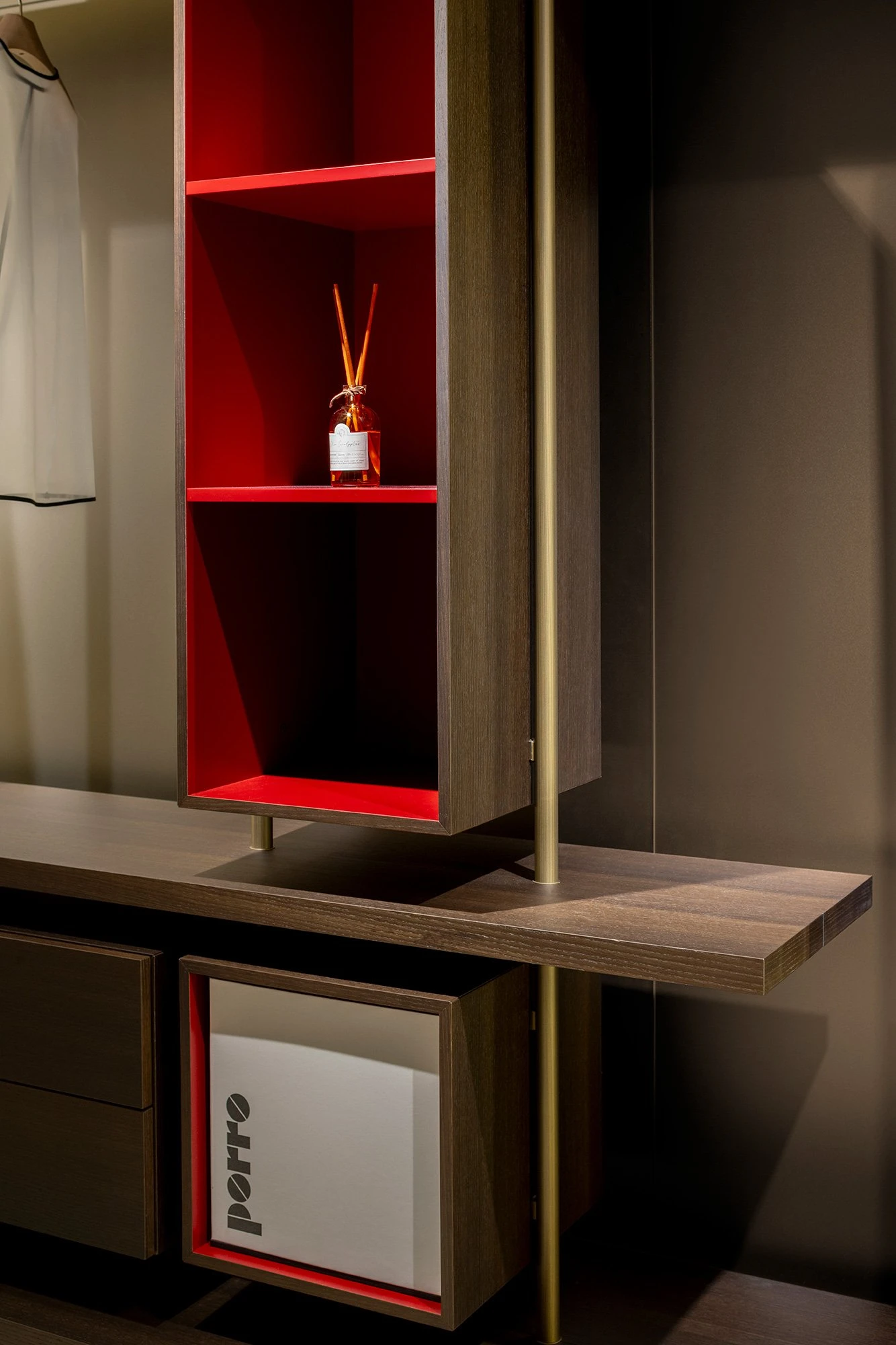 The Boutique Mast dressing room conveys a feeling of harmony in the dining room, featuring thin round uprights in burnished brass hosting the mirror, cantilevered shelves in heat treated oak and rosso cina lacquered open element in a vibrating contrast.