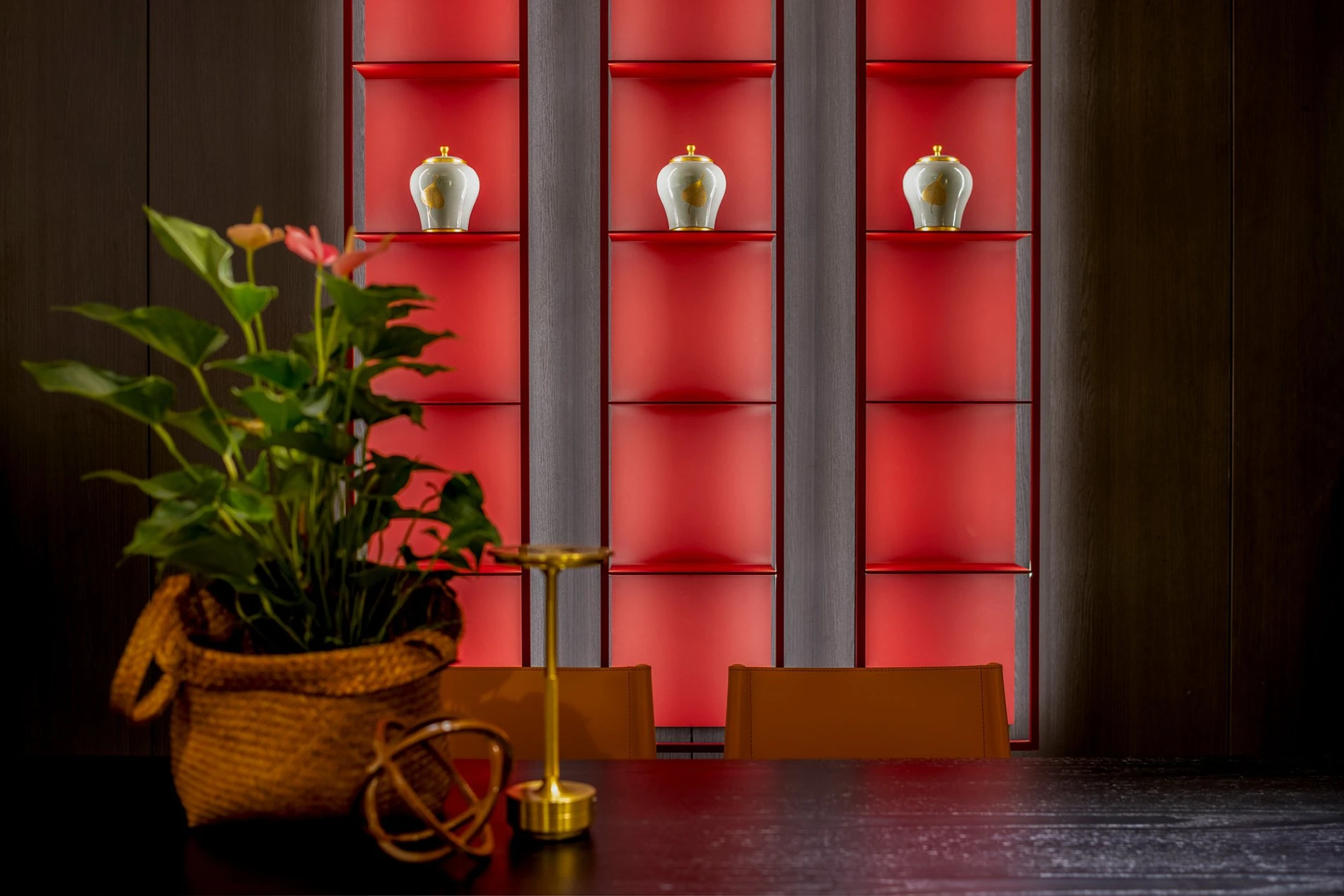 The ambiance is illuminated in a scenographic way by the Gap hanging bookcases designed by Carlo Tamborini in the precious rosso cina metal finish: a strong aesthetic sign that acts as a book-end as well as a light source, thanks to the built-in LED lighting that runs along its perimeter.