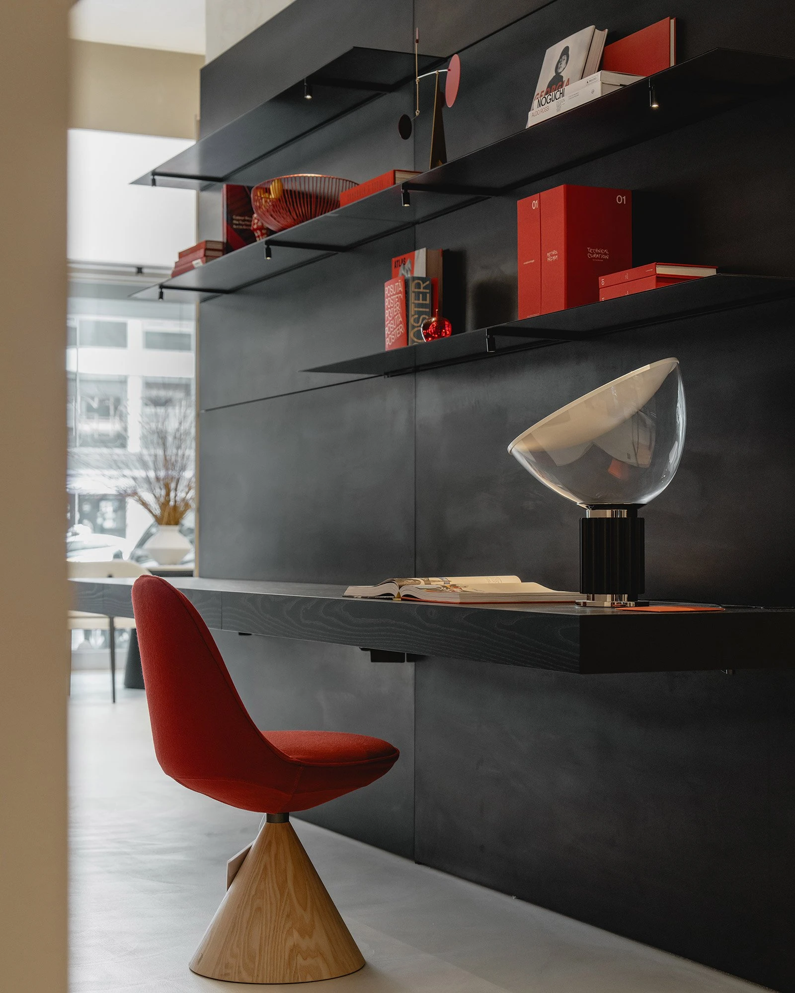Designing spaces through clear and elegant signs, defined by the rigour of the lines, the premium finishes, the design quality: in the hallway the Load-it bookcase with steel wall panels and shelves creates a wall-mounted boiserie. The Modern black stained ash wood desktop, transforms it into a functional home-working space, perfectly matching the Romby chair by GamFratesi, whose truncated cone base in solid ash wood, with an exquisite flared shape, is connected to a swivel upholstered seat, soft and compact, covered in red fabric.
